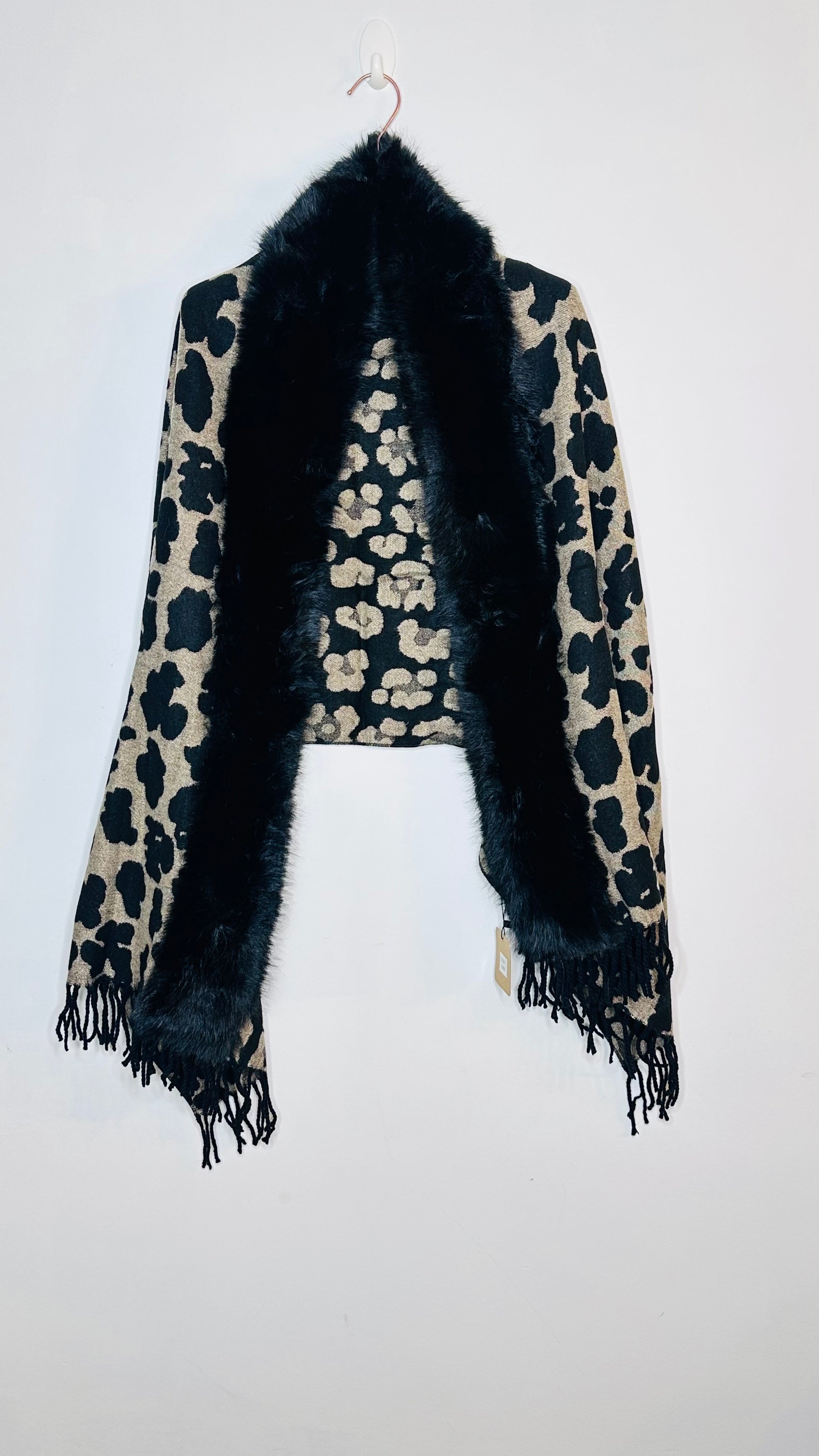 Rectangular shawl, patterned with fur and finished with fringe.