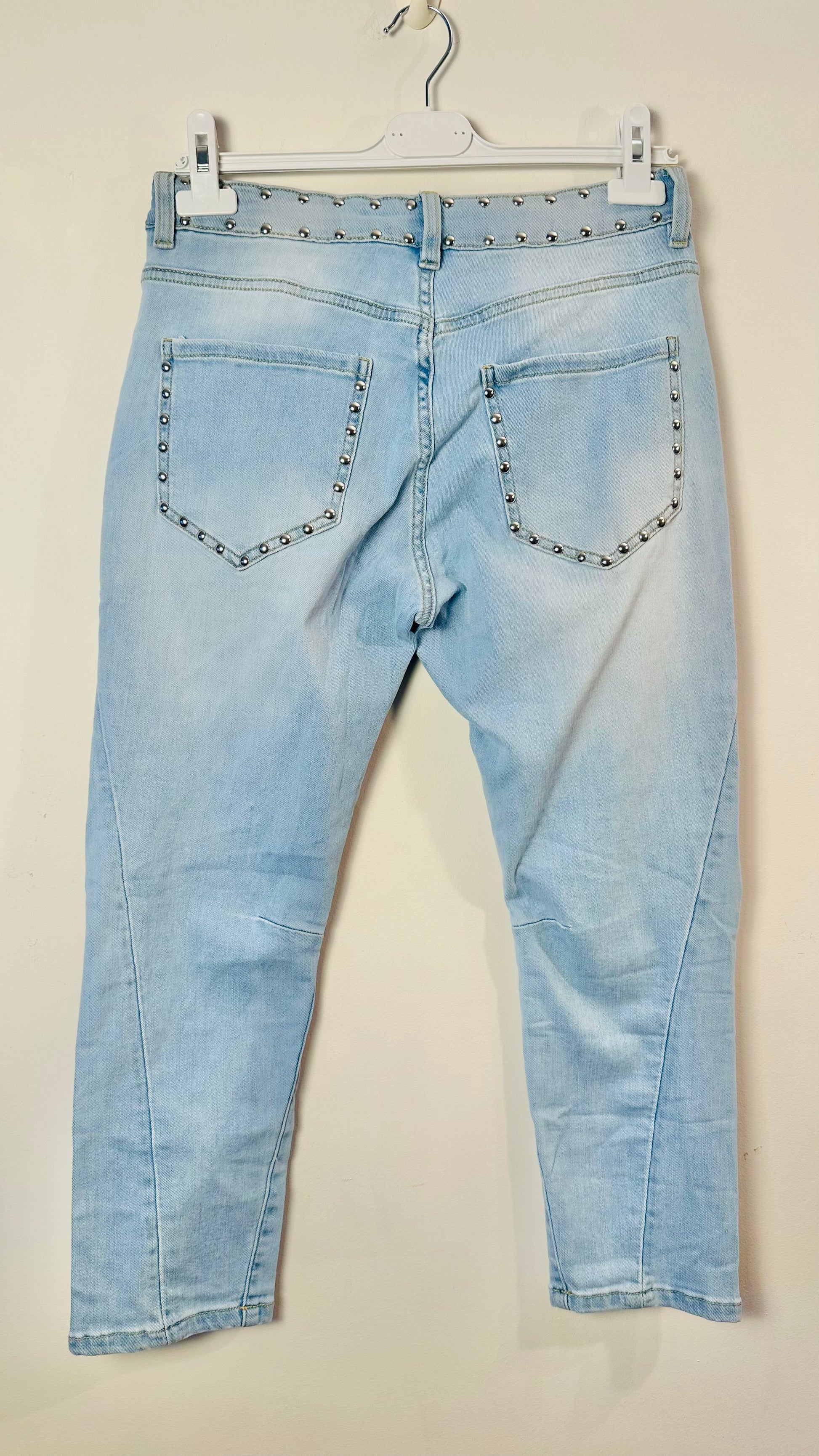 Pantalón tejano, tono, claro y tejido suave, de marca SWOMAN con detalle de tachas y rotos con parches.