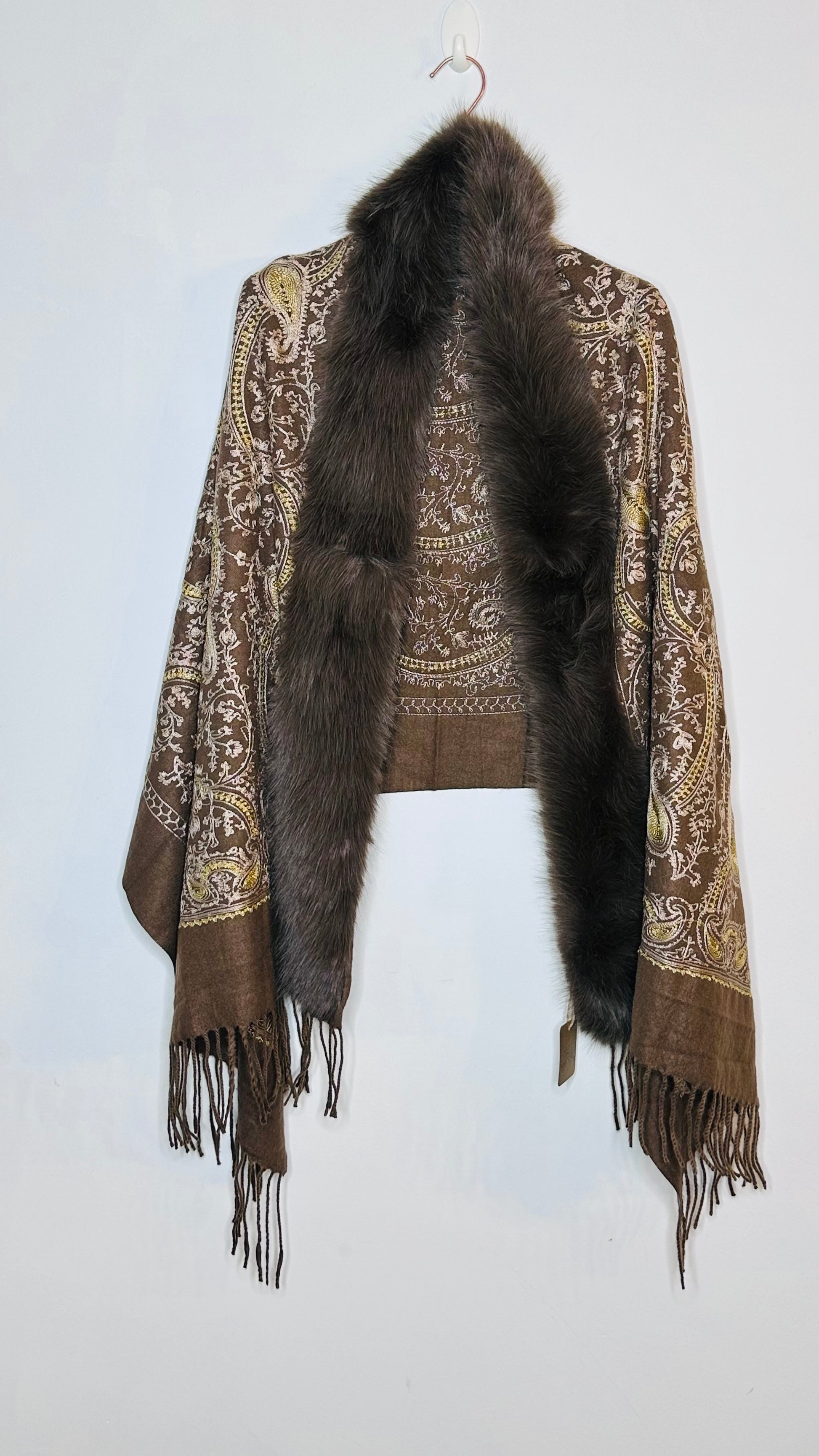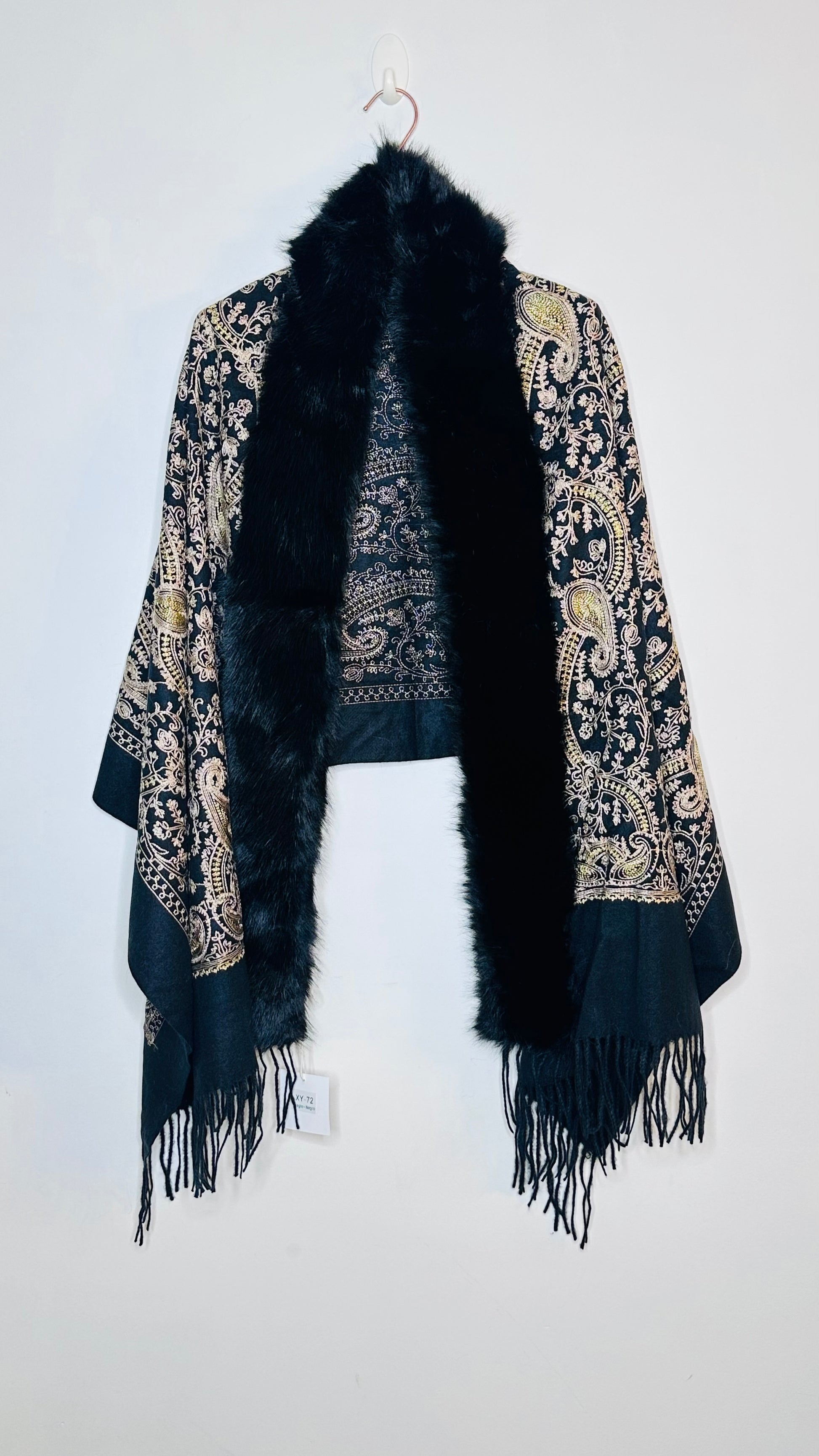 Chal con forma rectangular , estampado con pelo y acabado con flecos.