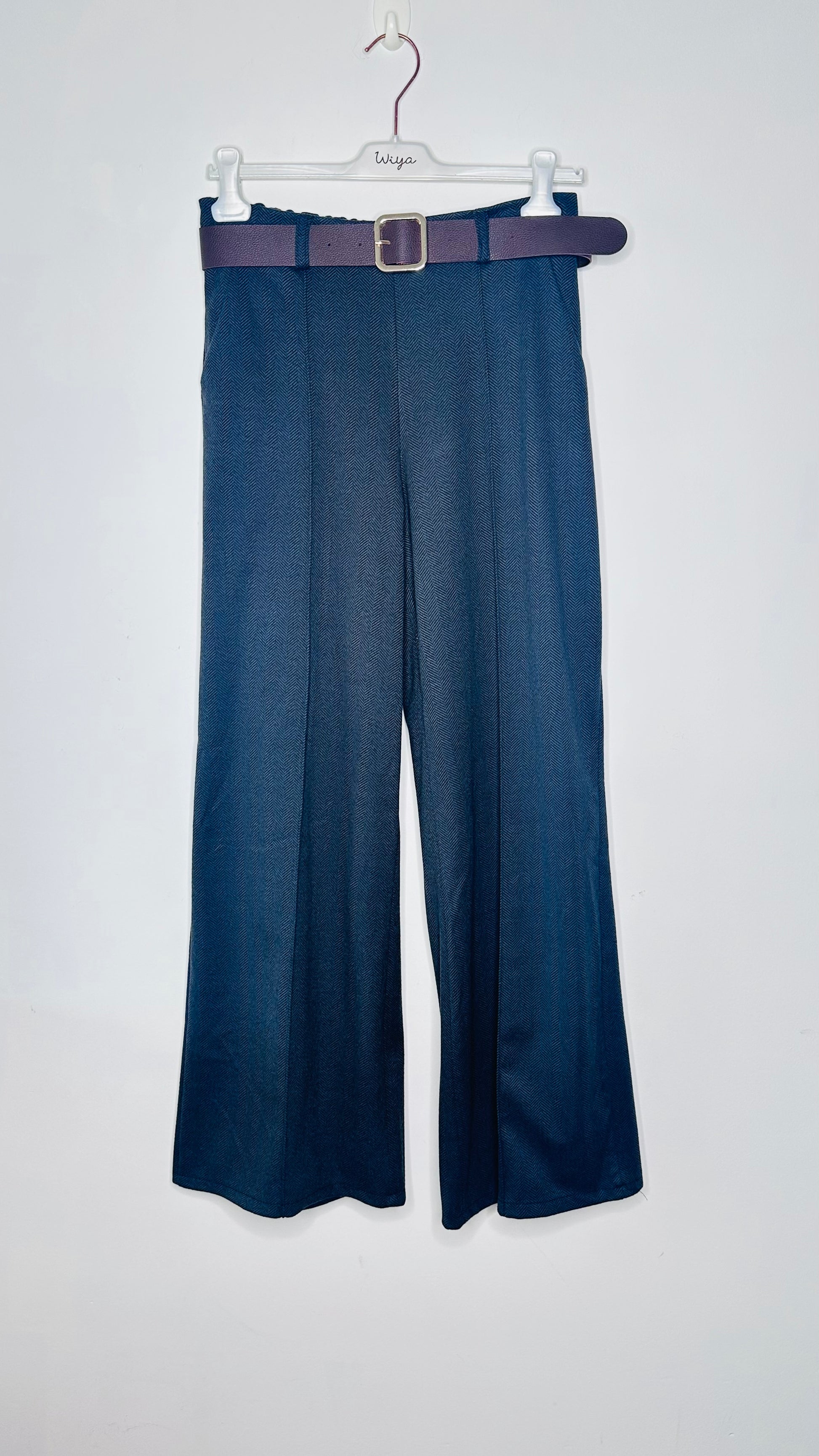 Pantalón palazzo con un tejido calentito . Nervio en el delante, bolsillos, cintura elástica y cinturón incluido.