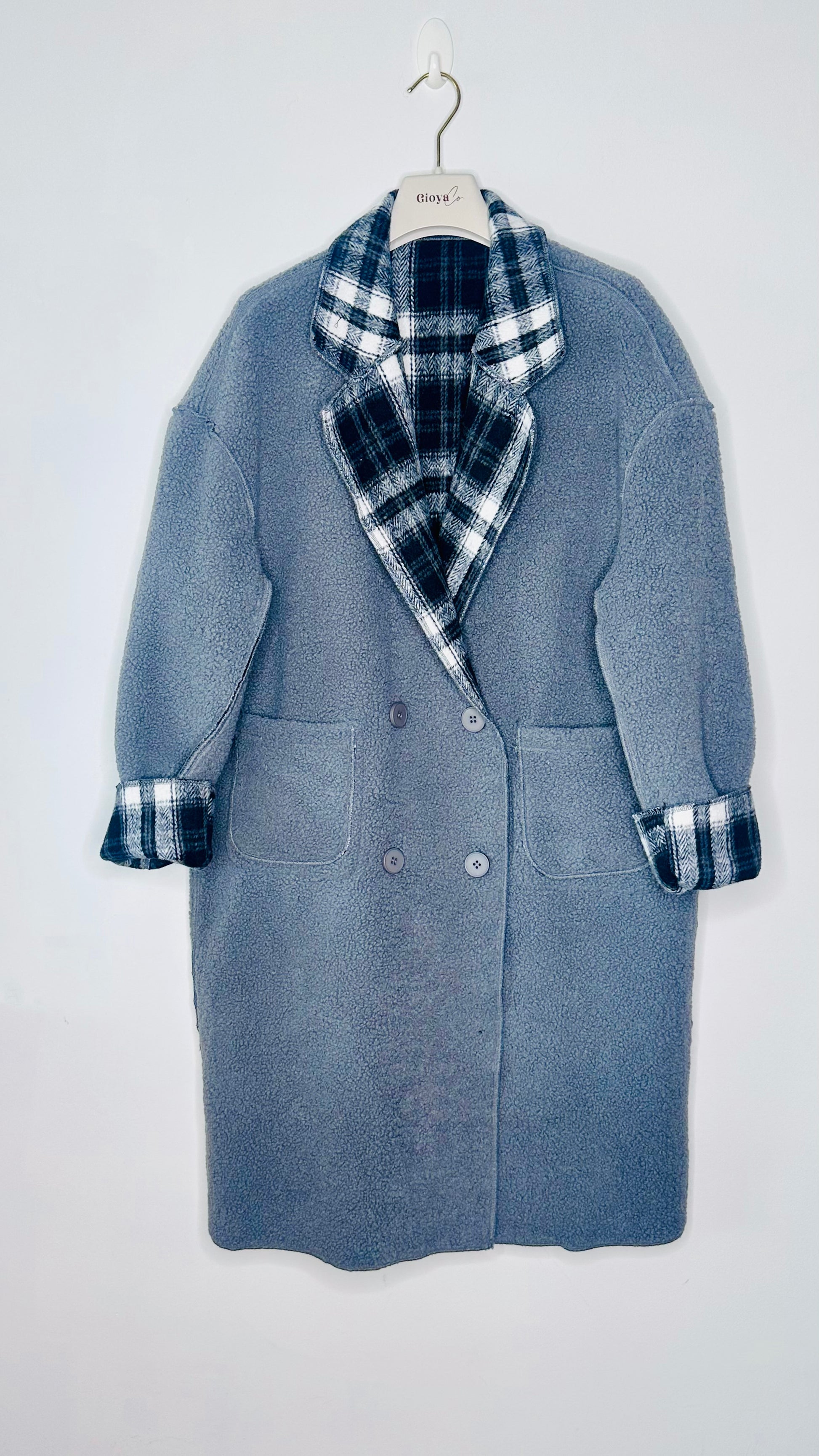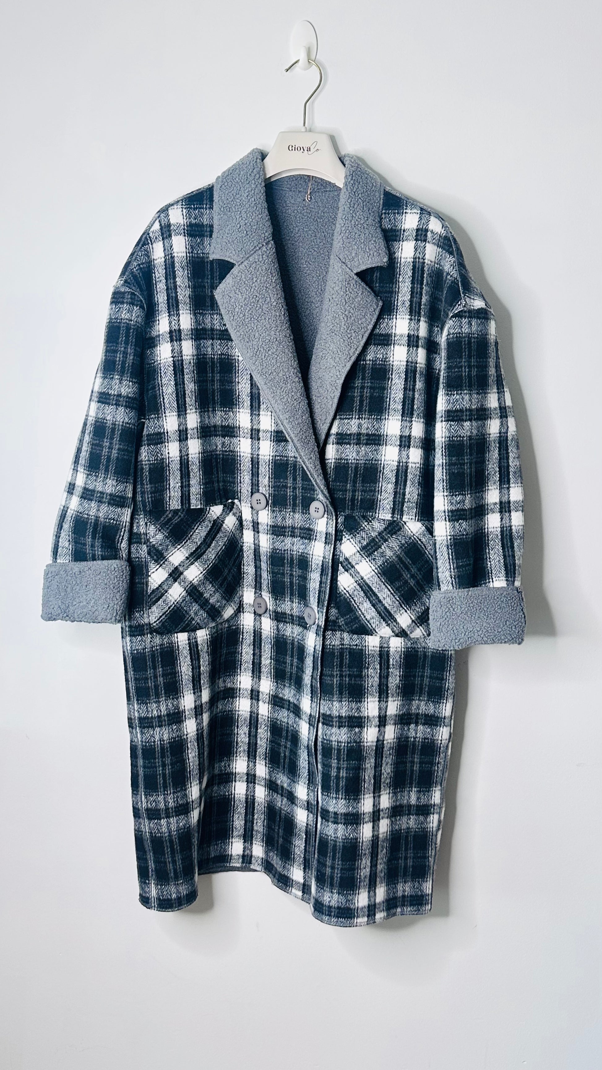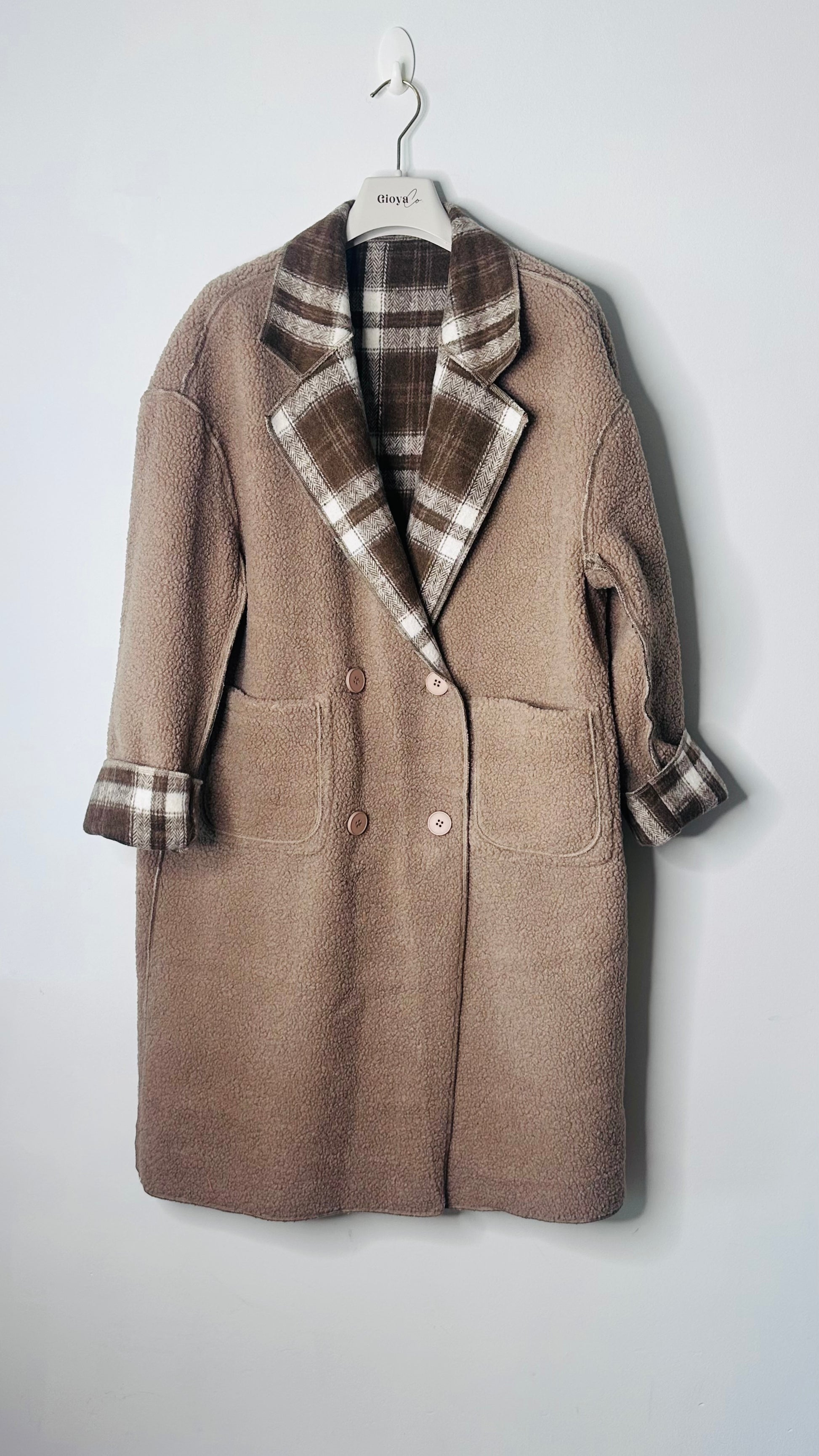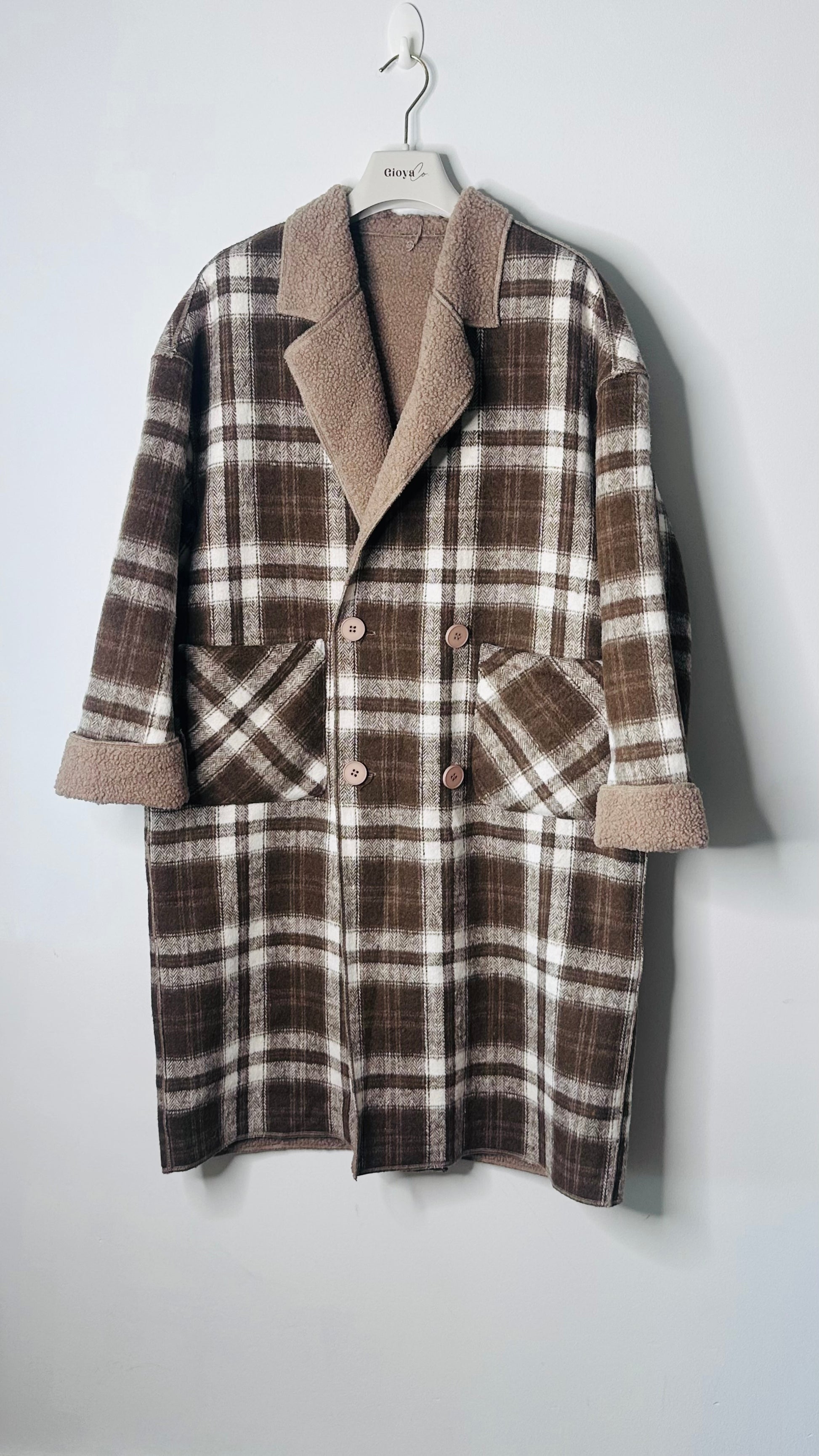 Abrigo de cuadros reversible de paño y borrego. Con solapa,cruzado con doble botón tiene bolsillos de parche en el delante.