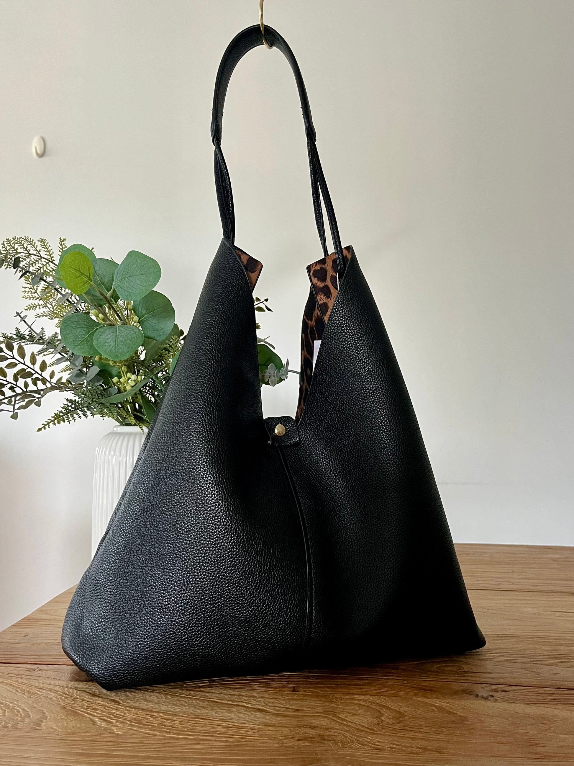 Bolsa reversible con ojetes y cierre de clip . Interior con base y neceser.