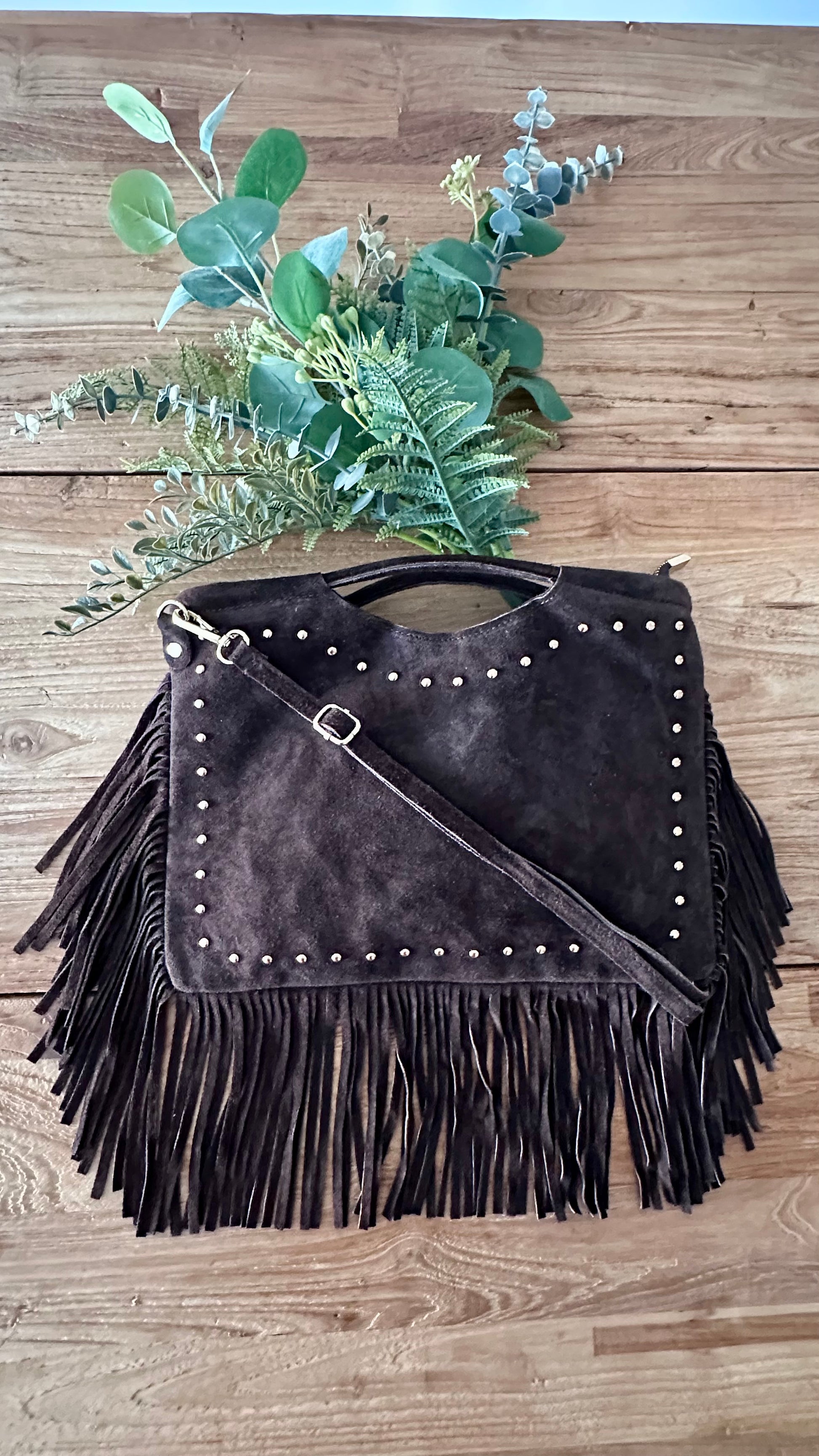Bolso de mano con tachas y flecos. Tiene tira larga para bandolera. Esta forrado, cierre de cremallera y tiene cremallera exterior.