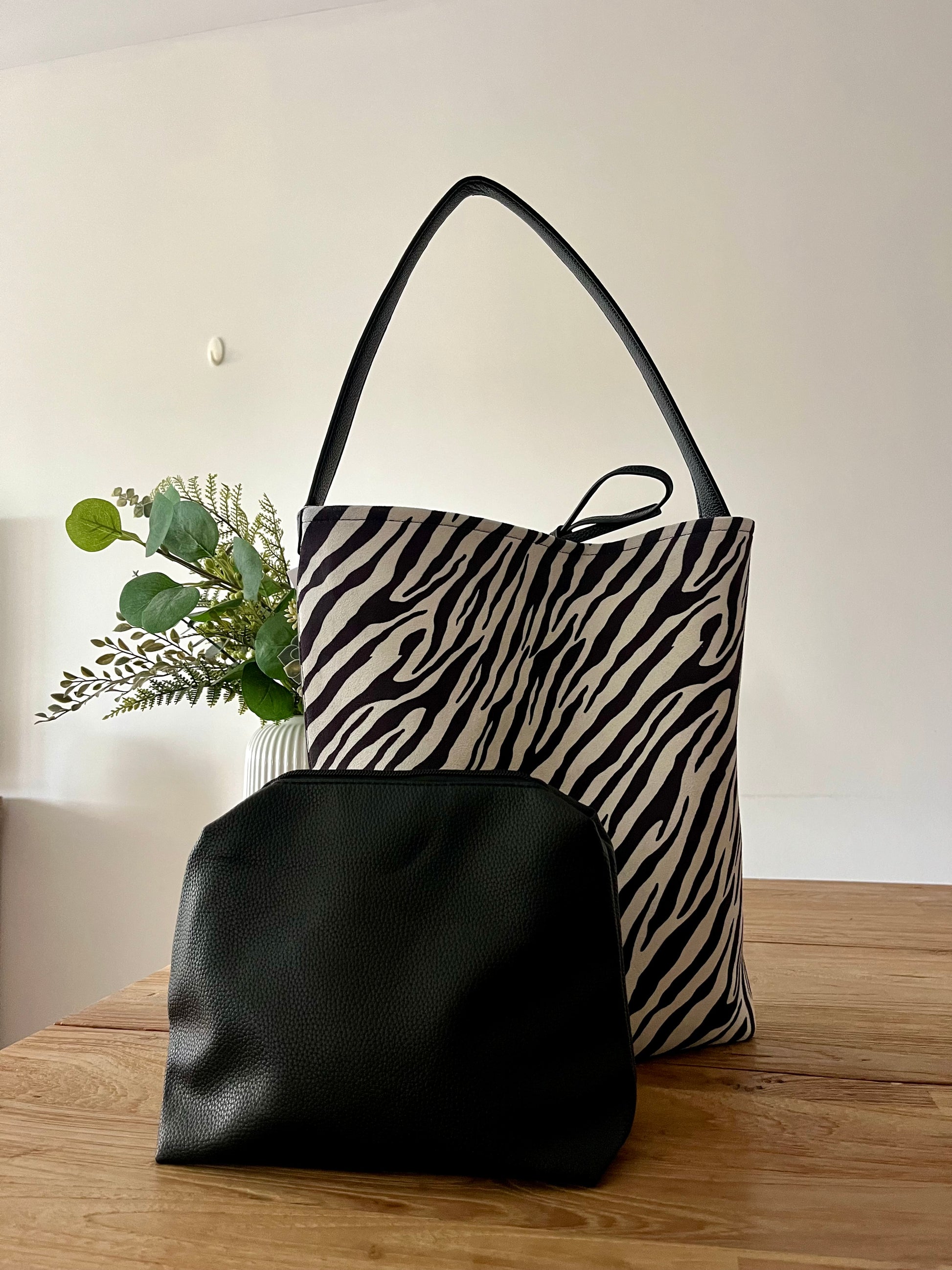 Bolso shopper reversible de cebra. Interior con base y neceser. Cierre de cuerda.