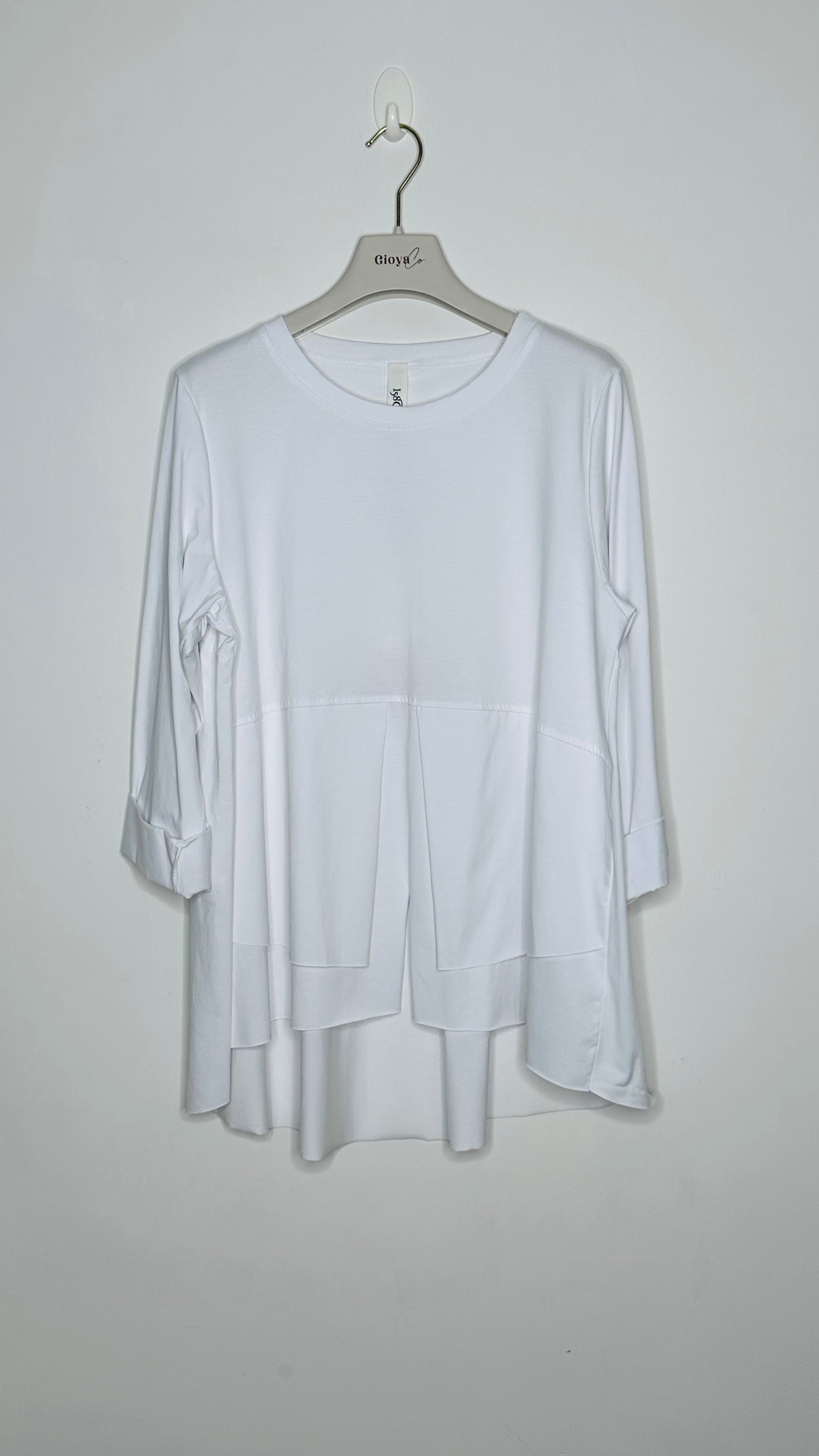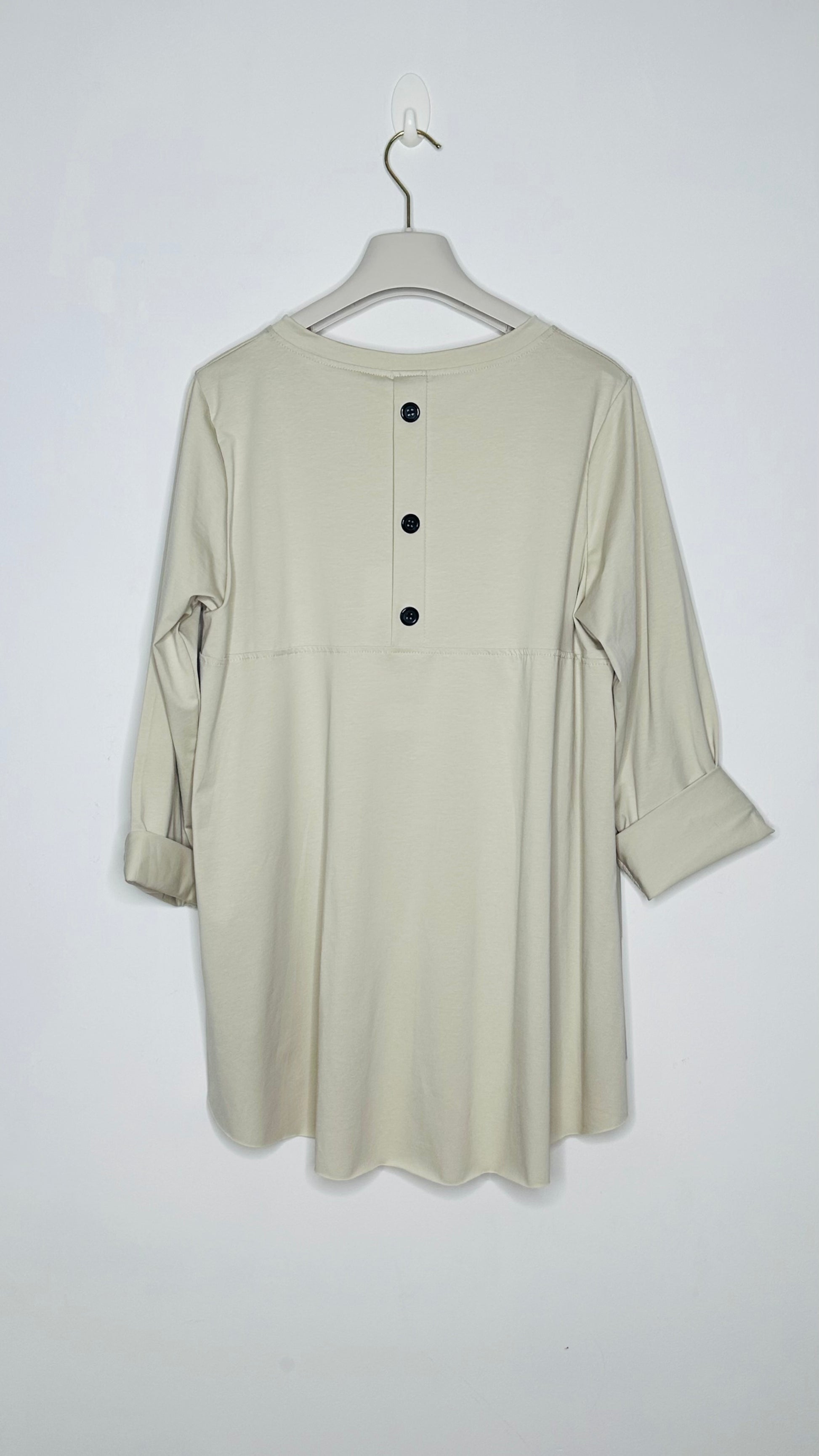 Camiseta de cuello redondo con manga larga forma evase. En el delantero en la parte de abajo hace efecto dos capas con aberturas. Es manga larga por detrás y en la espalda lleva botones de adorno.