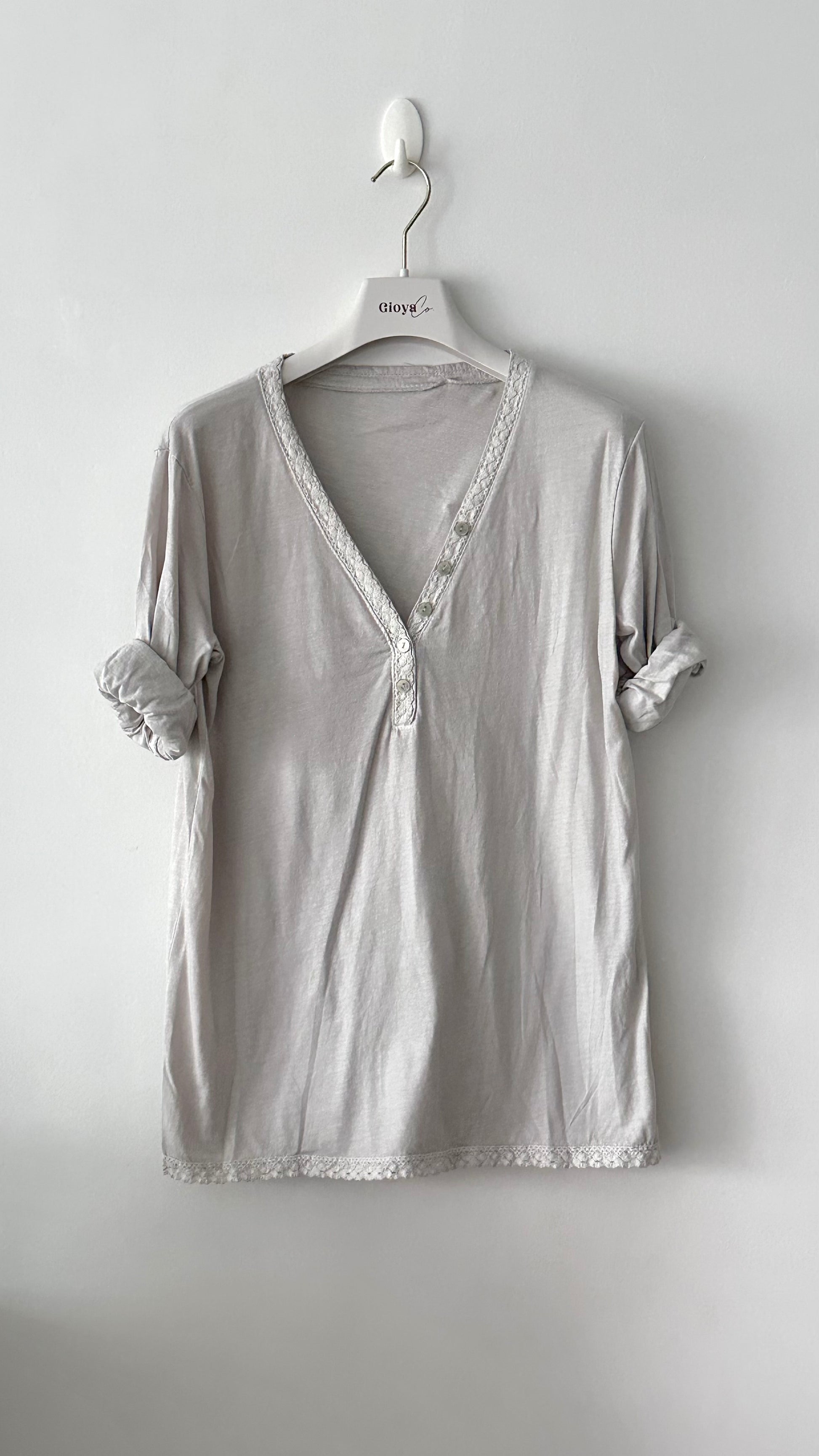 Camiseta pico con botones nacarados y acabados con puntilla.