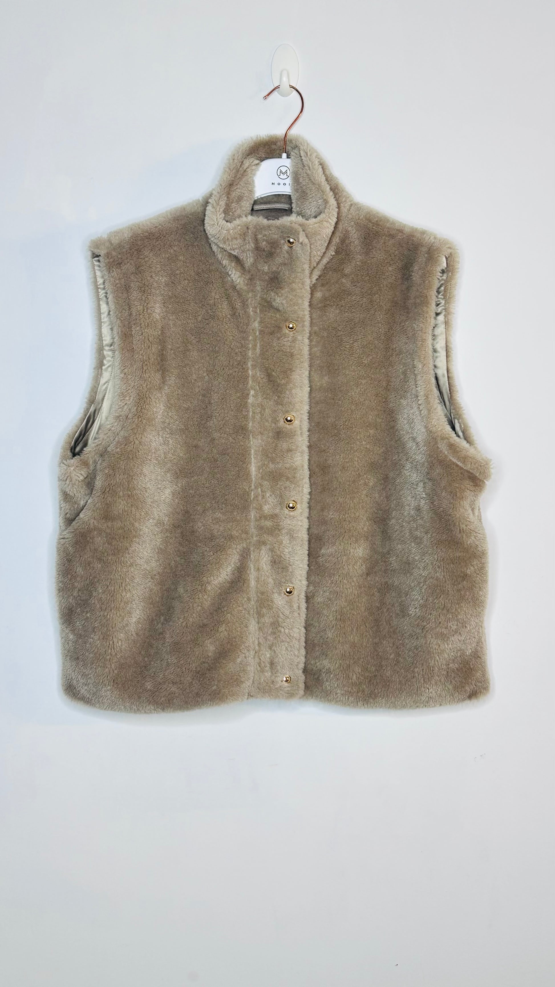 Chaleco de pelo, con botones dorados y cremallera interior es cuello perkins lleva bolsillos laterales y está forrado