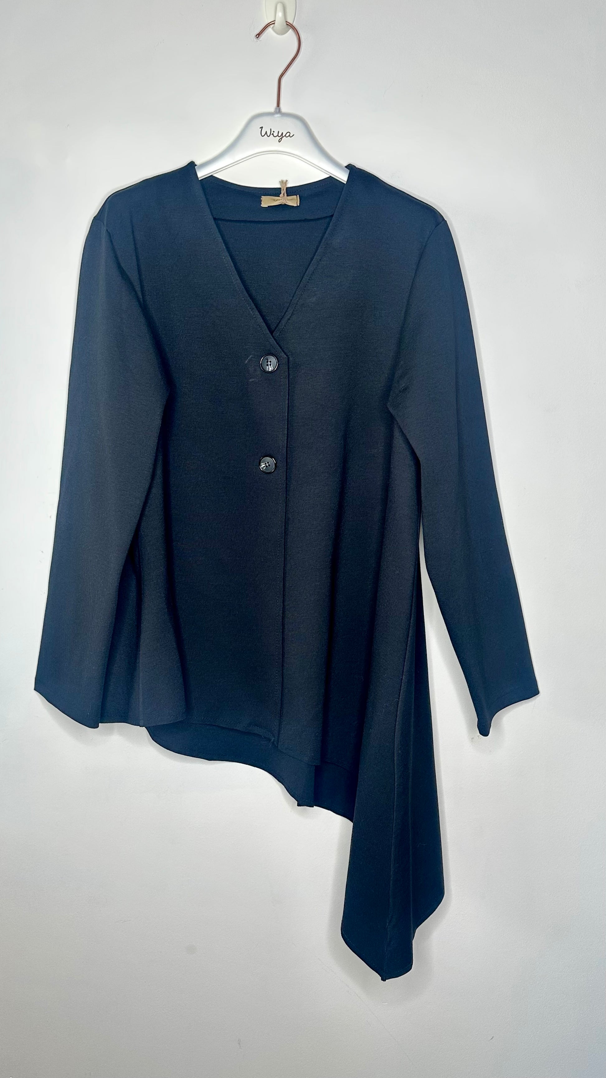 Chaqueta asimétrica de punto roma , con dos botones de pasta .