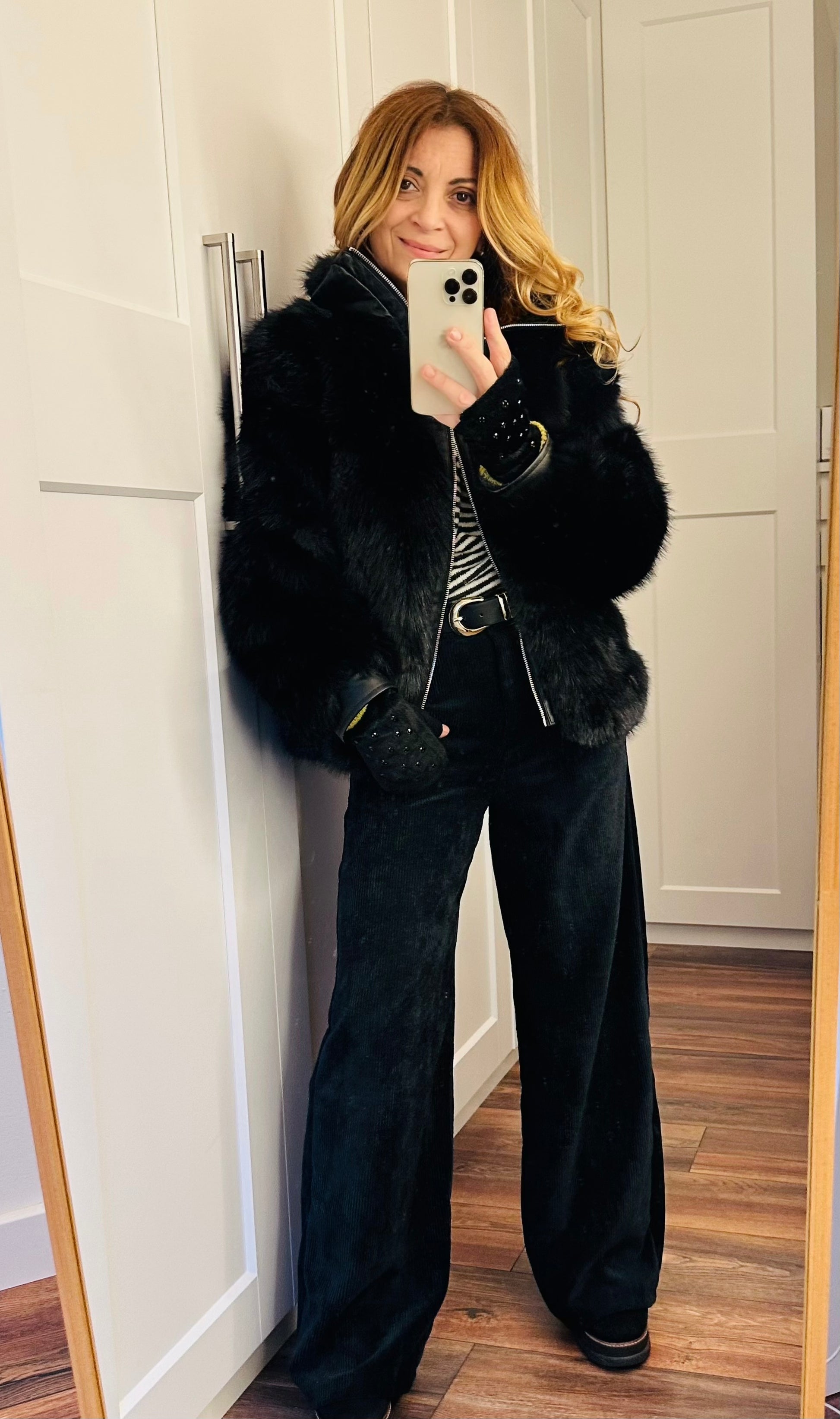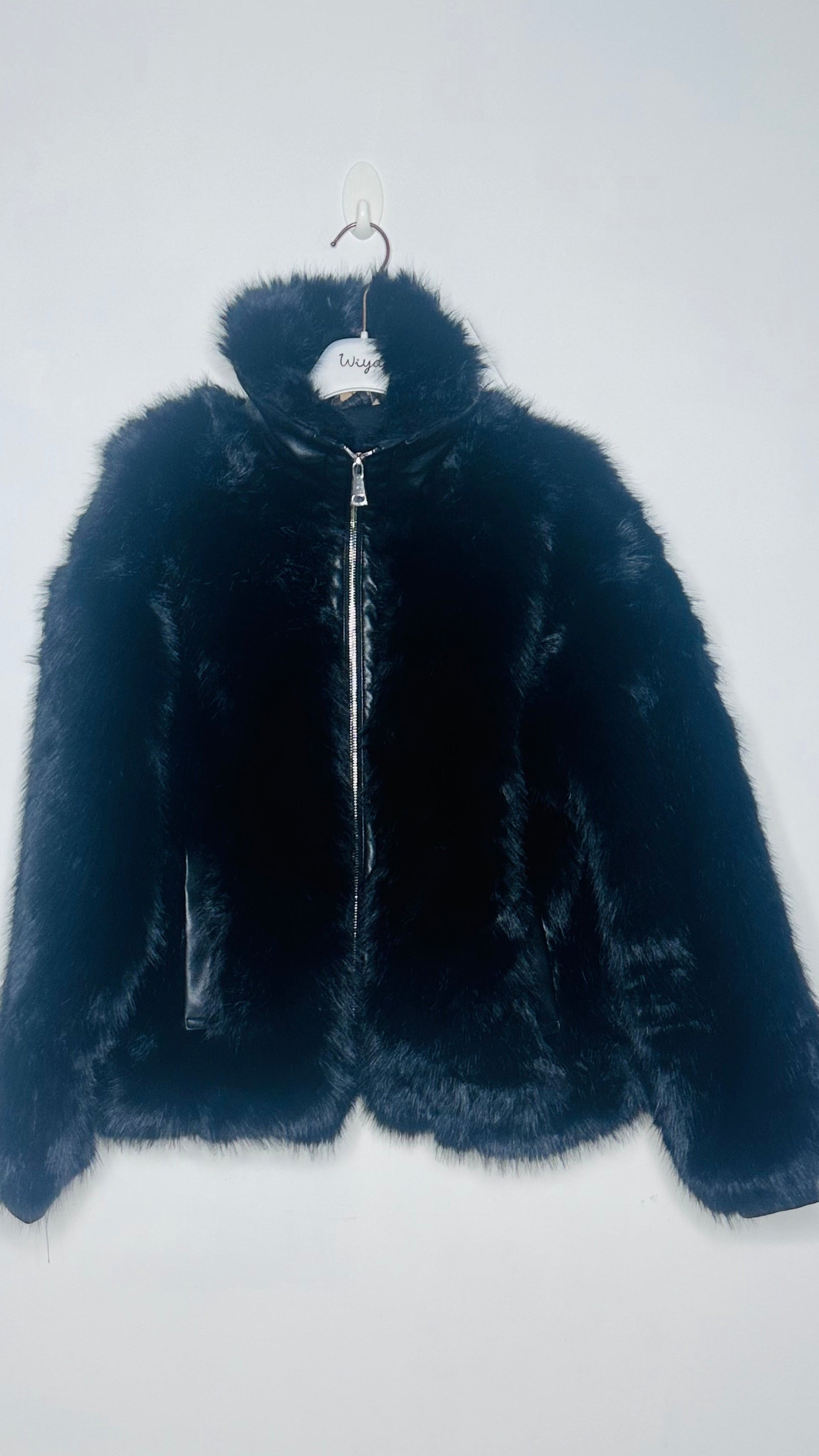 Chaqueta de pelo con cremallera acabados de poli piel, interior, forrado con tela de Animal print, con bolsillos laterales y cremallera.