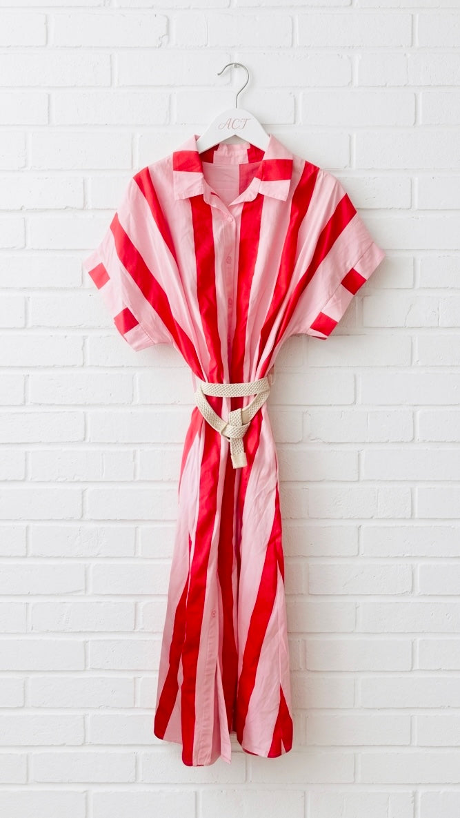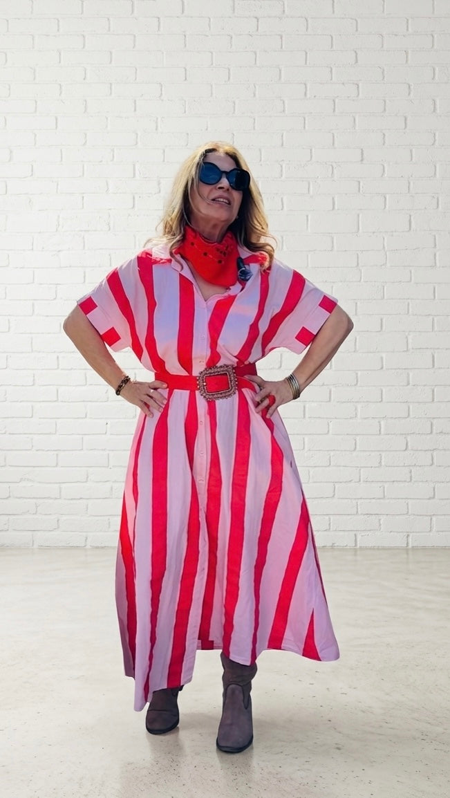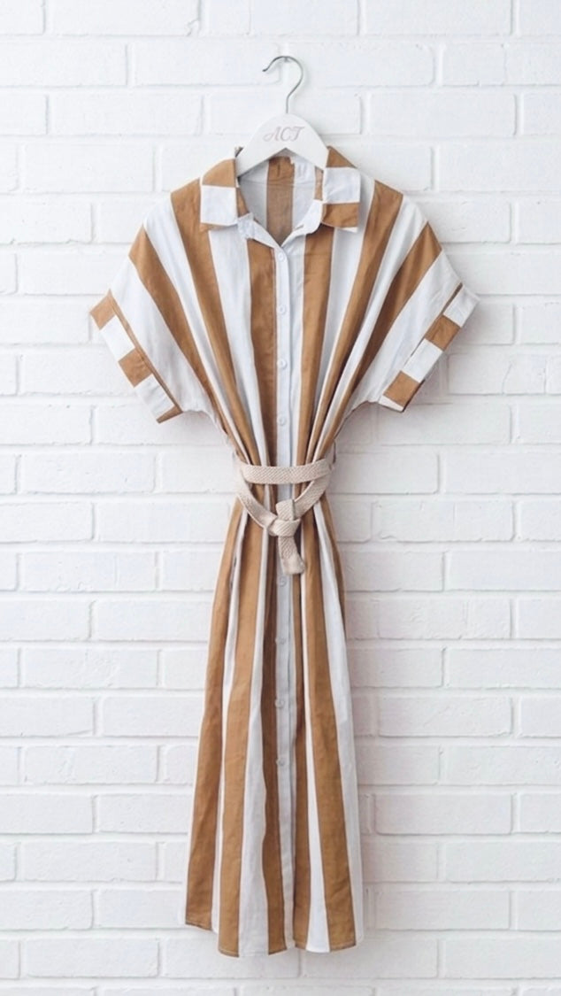Un cautivador patrón de rayas verticales anchas en contraste. Cuello de solapa clásico y manga corta estilo japonés que aporta un aire relajado y chic. Con bolsillos laterales. Tejido ligero y transpirable.