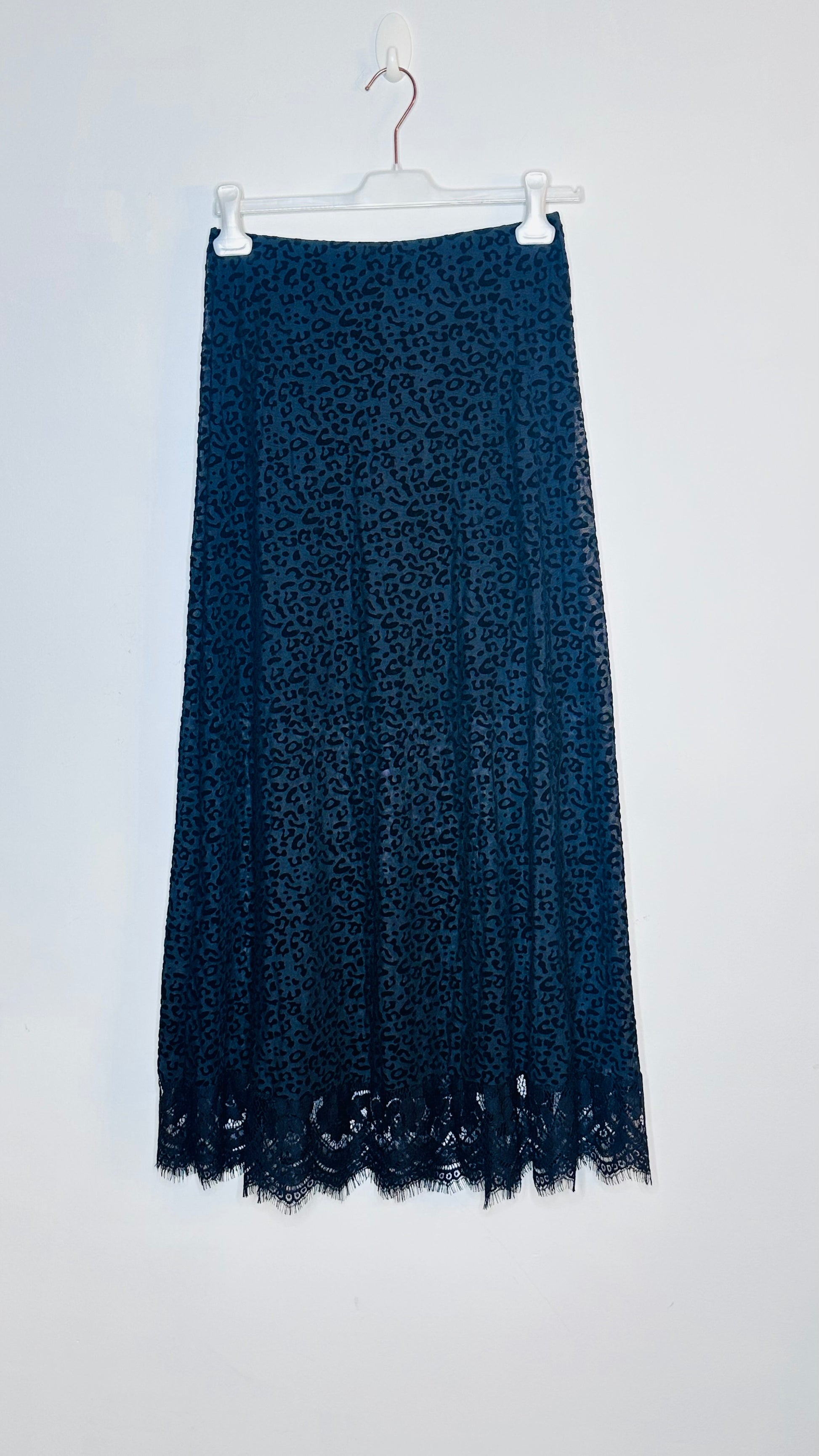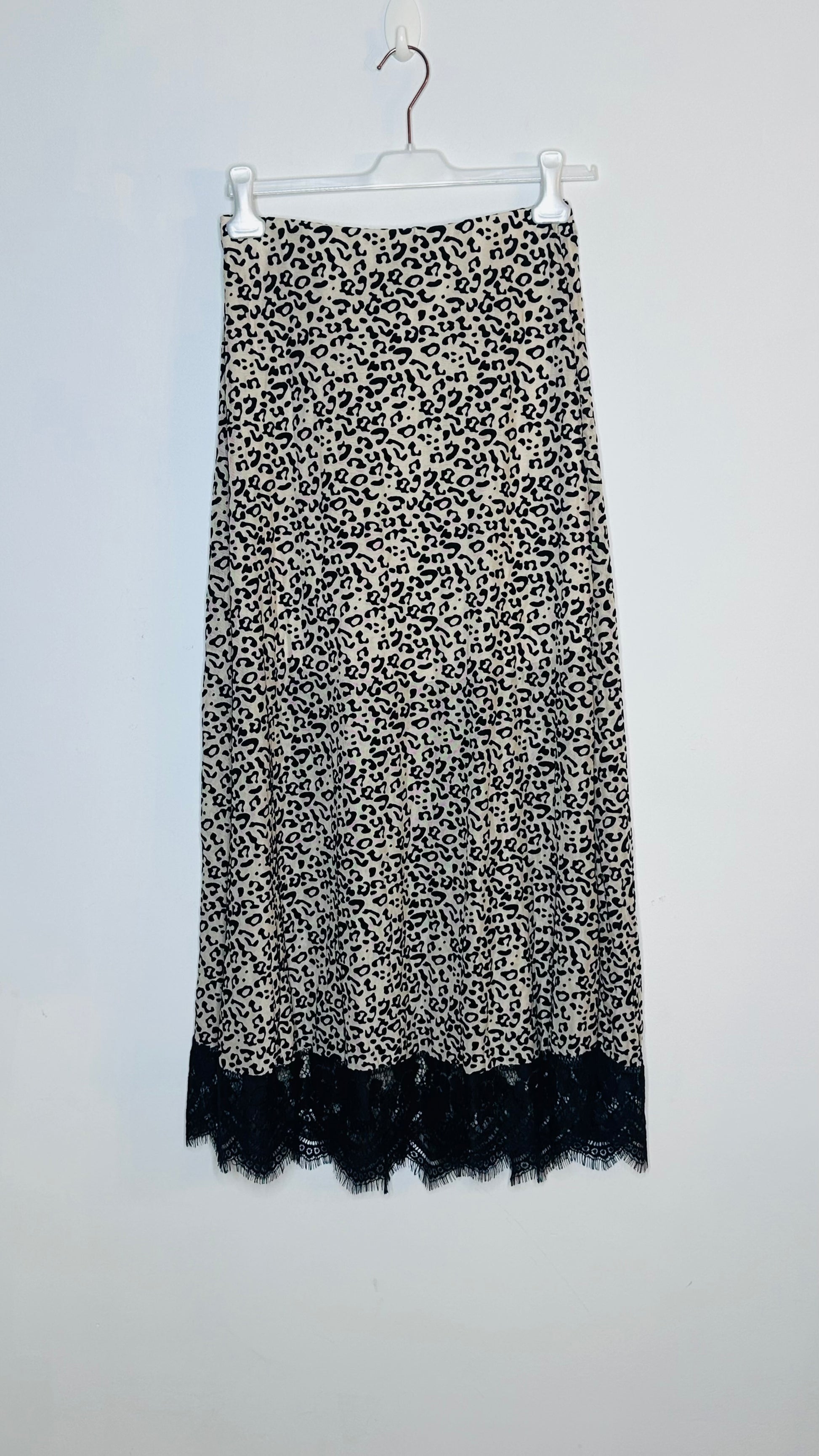 Falda larga de Animal print en terciopelo, lleva forro a mitad de la falda y encaje en el bajo con goma en la cintura.