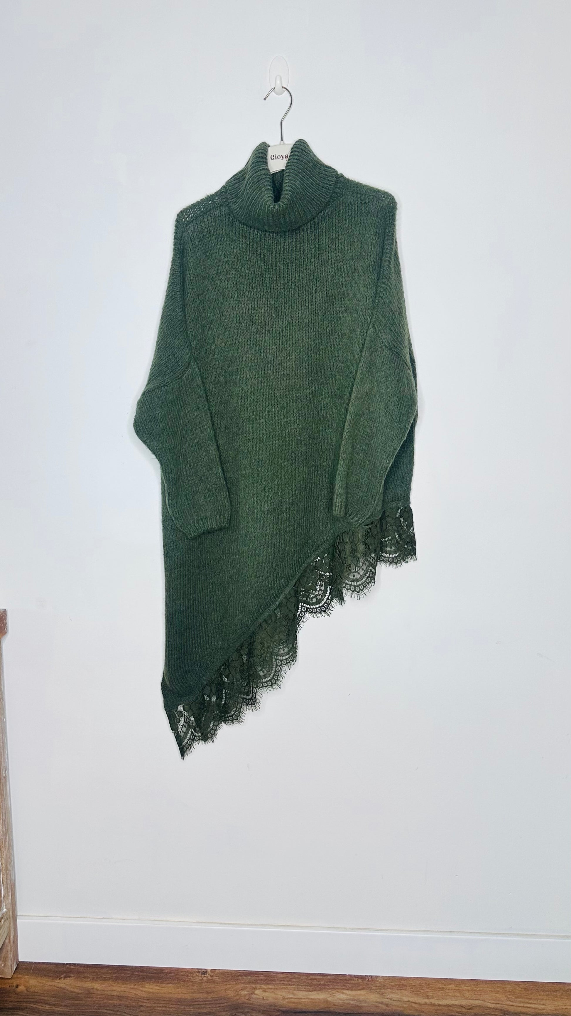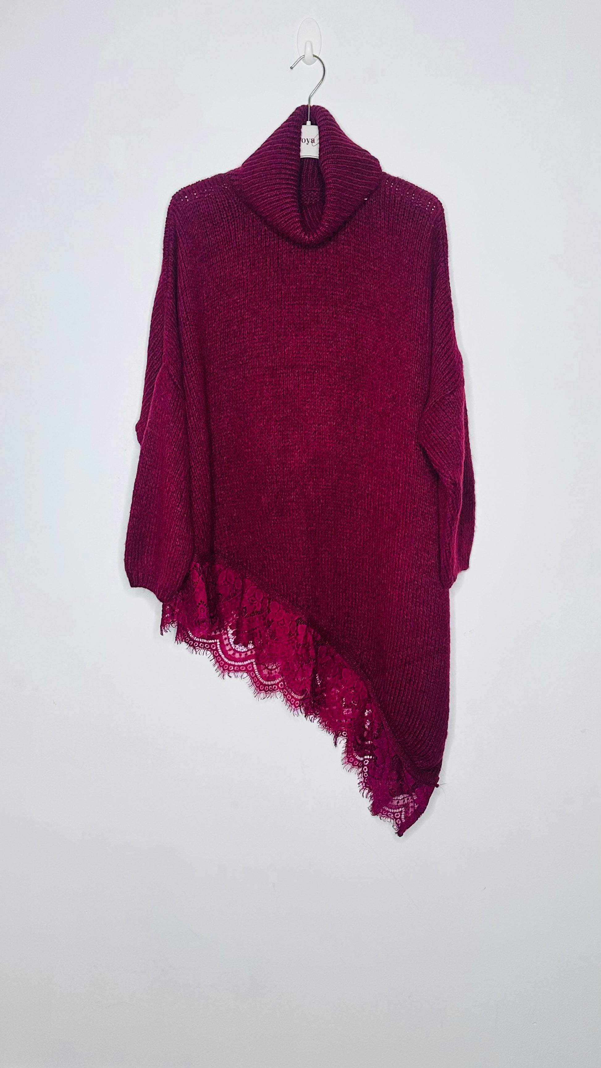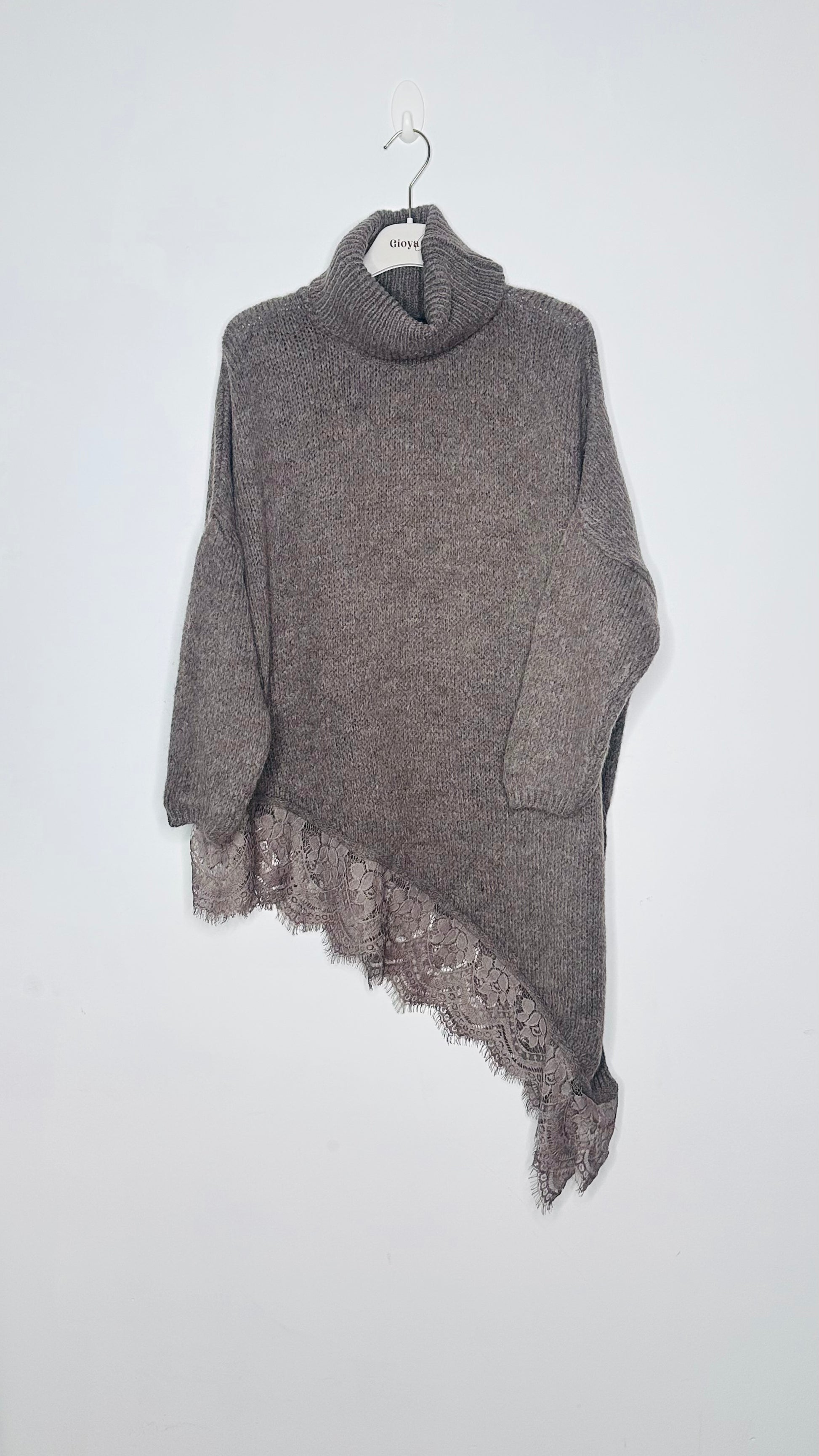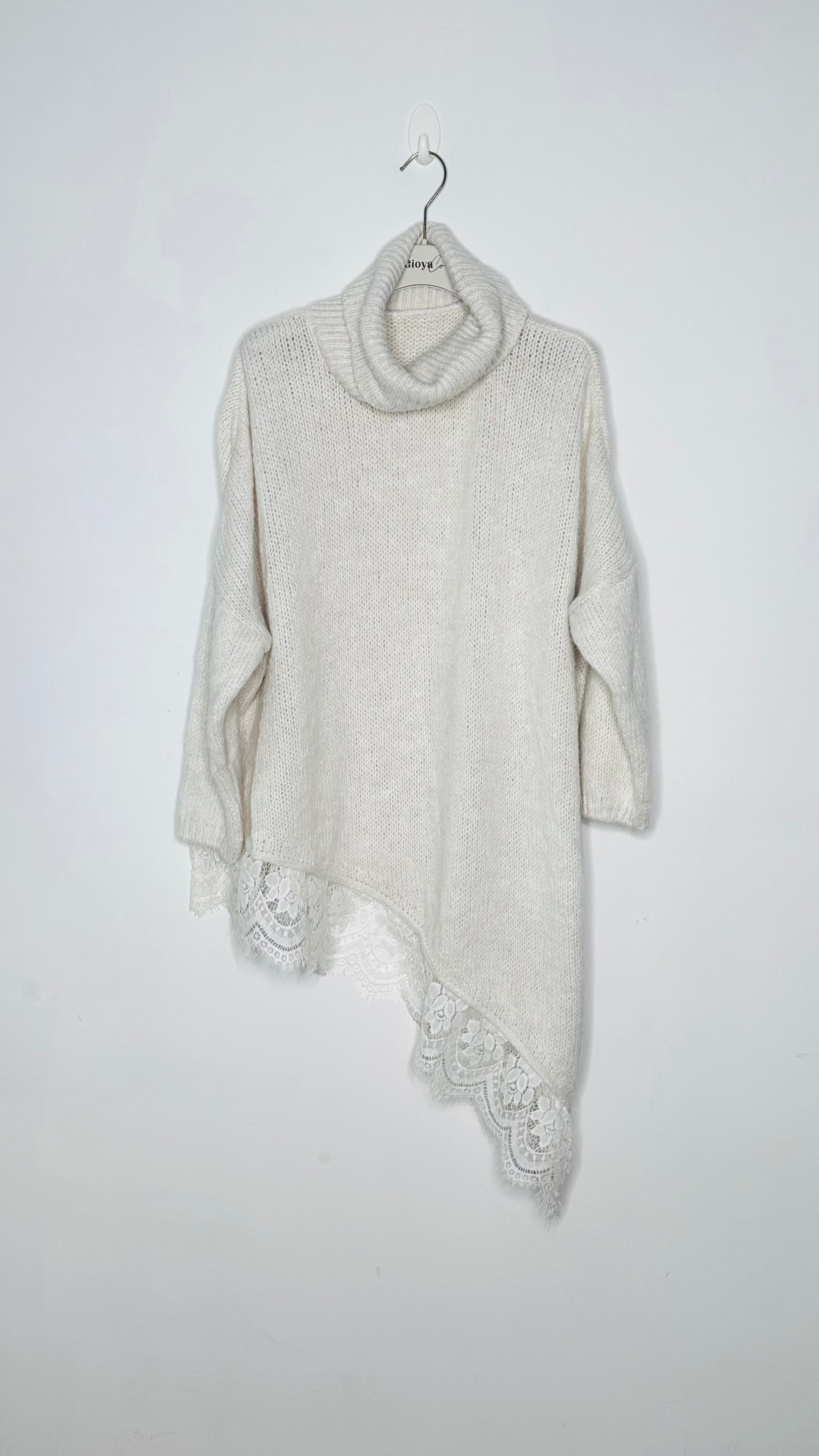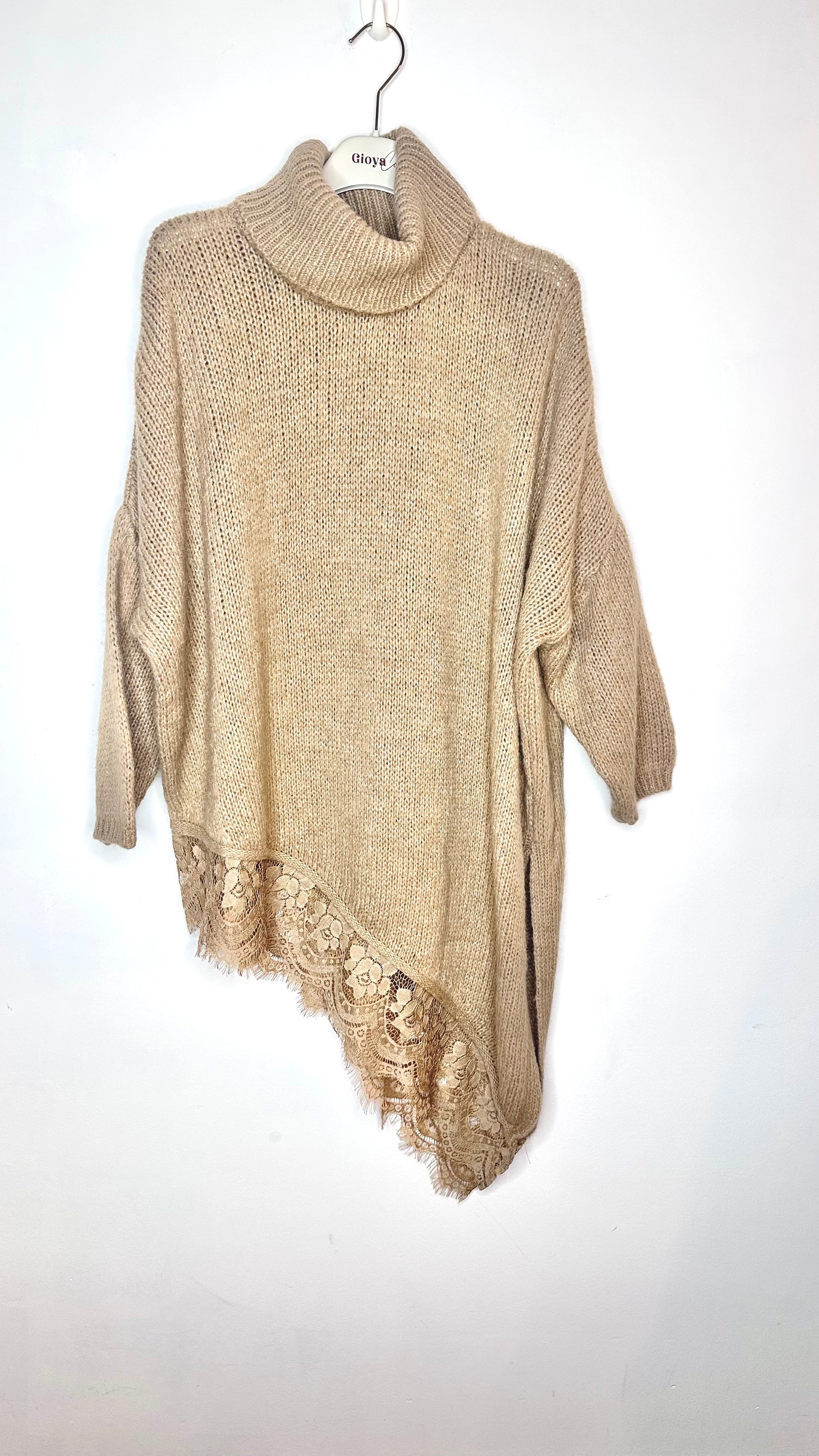 Jersey de cuello alto, asimétrico con corte en el lateral y puntilla en el bajo, manga larga, tejido súper suave.