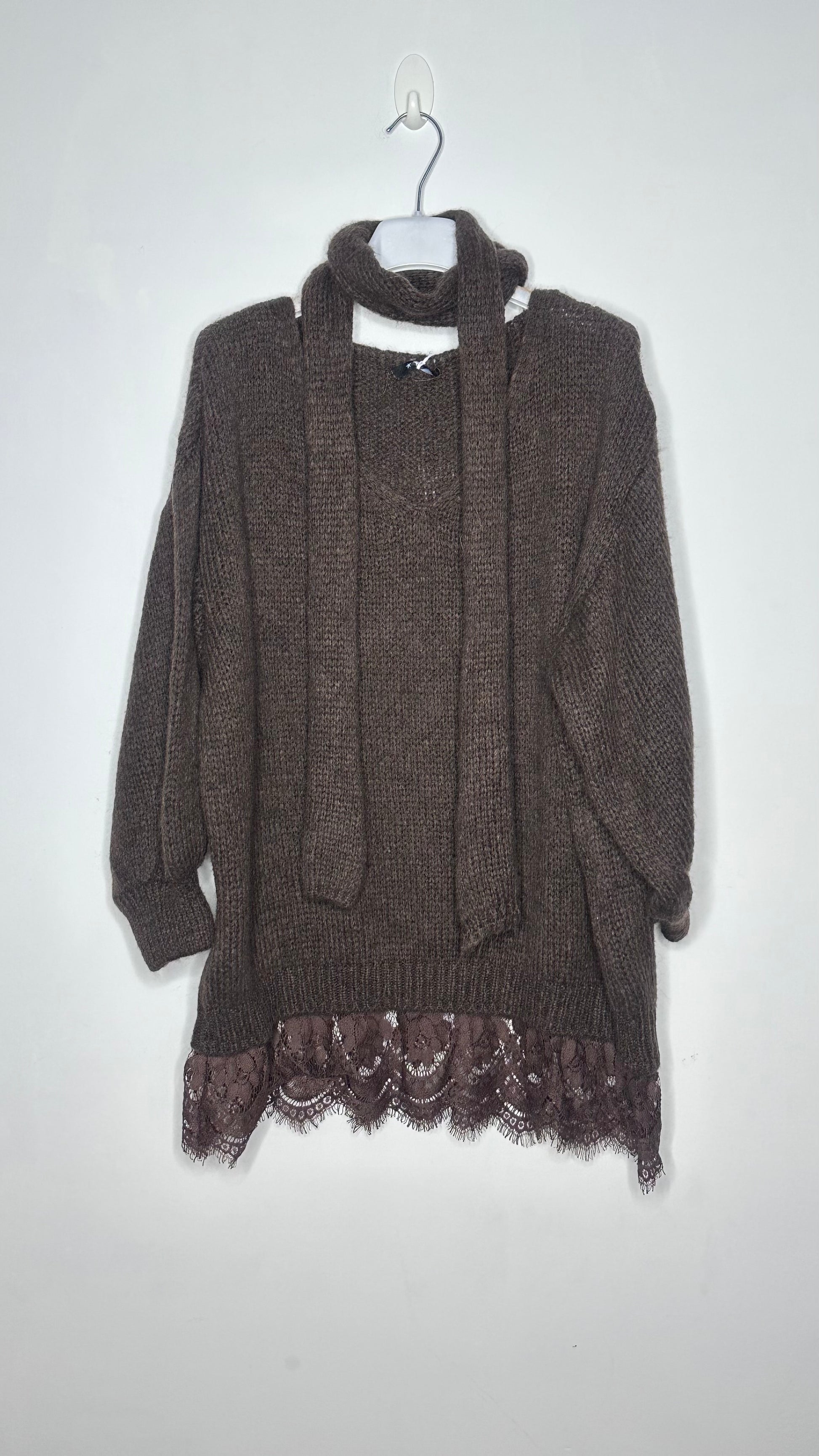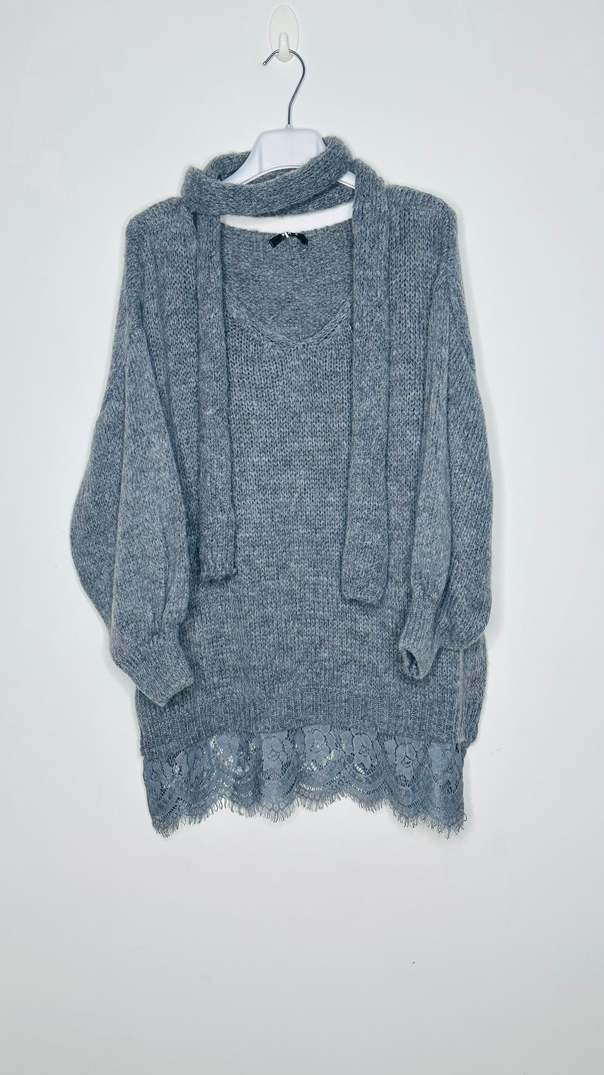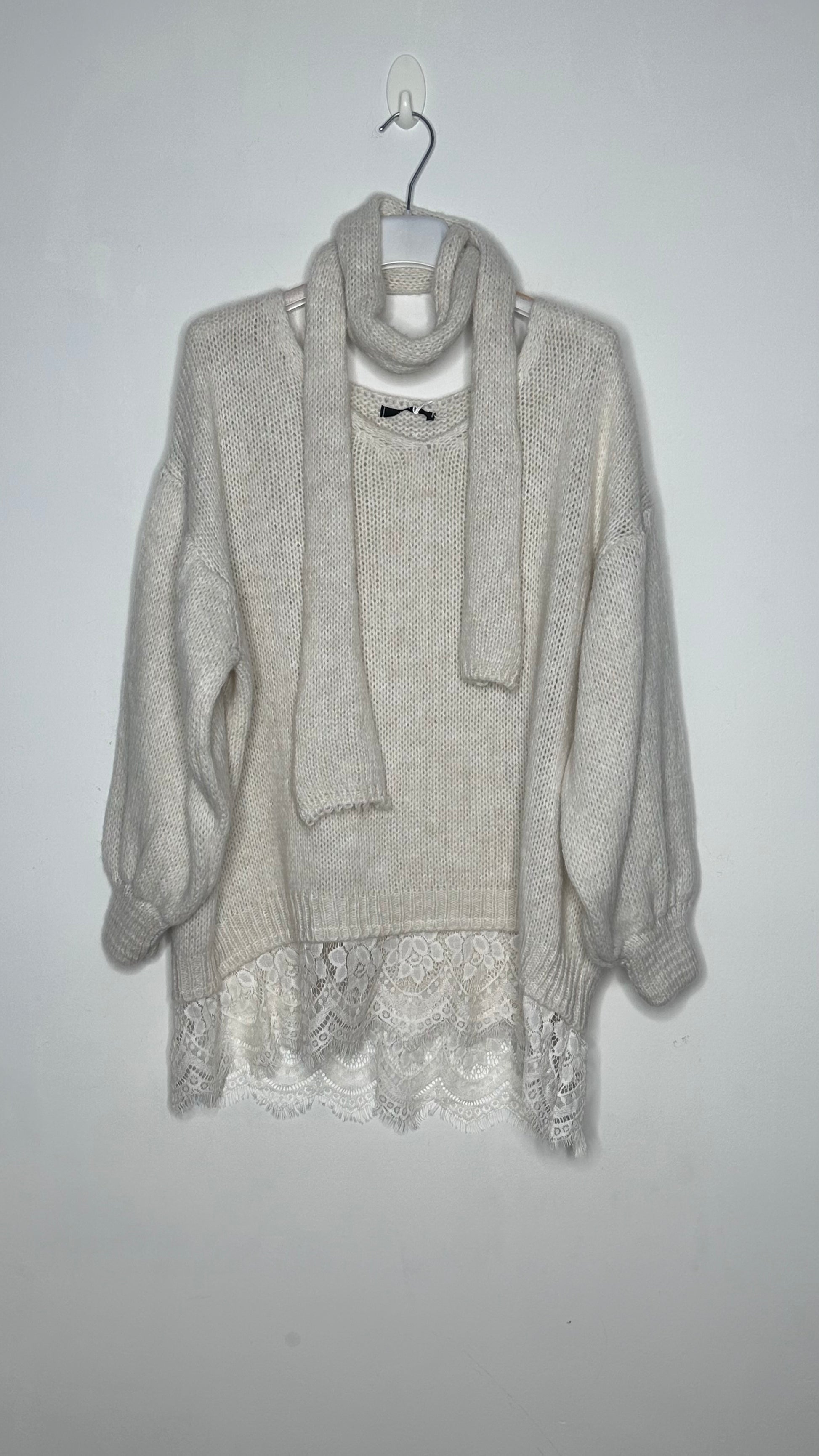 Jersey en cuello de pico, con manga larga y puntilla en el bajo de forma recta , con bufanda incluida