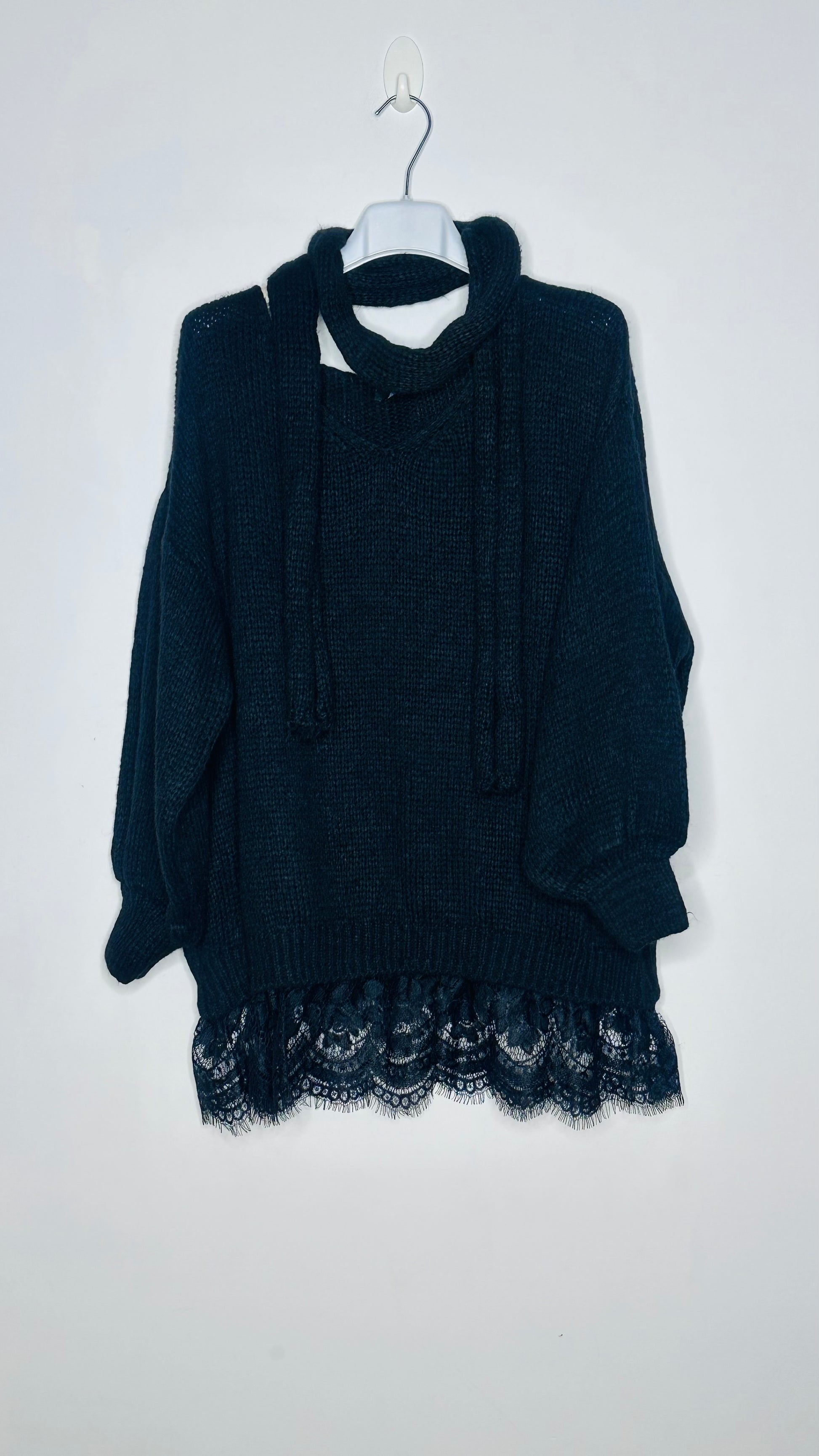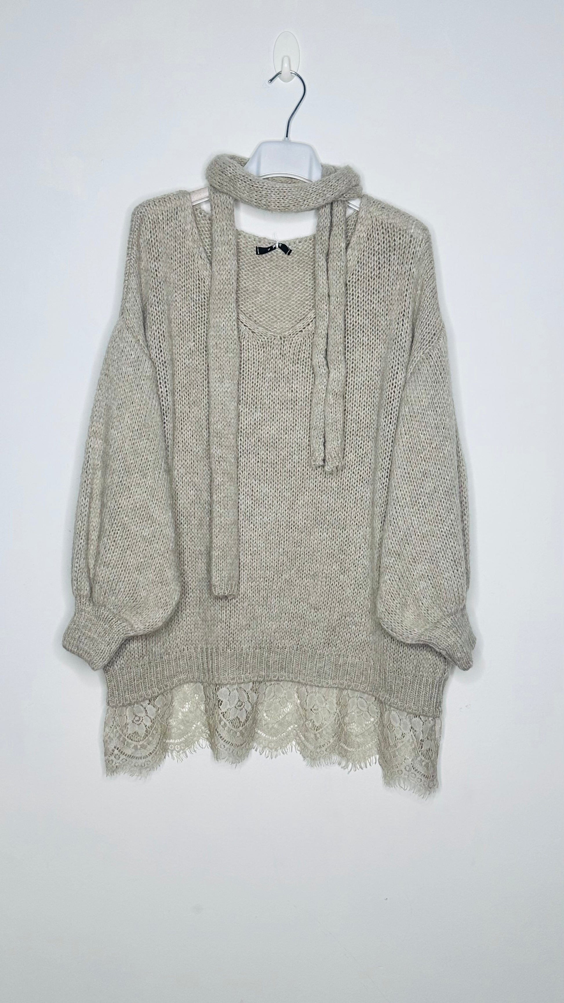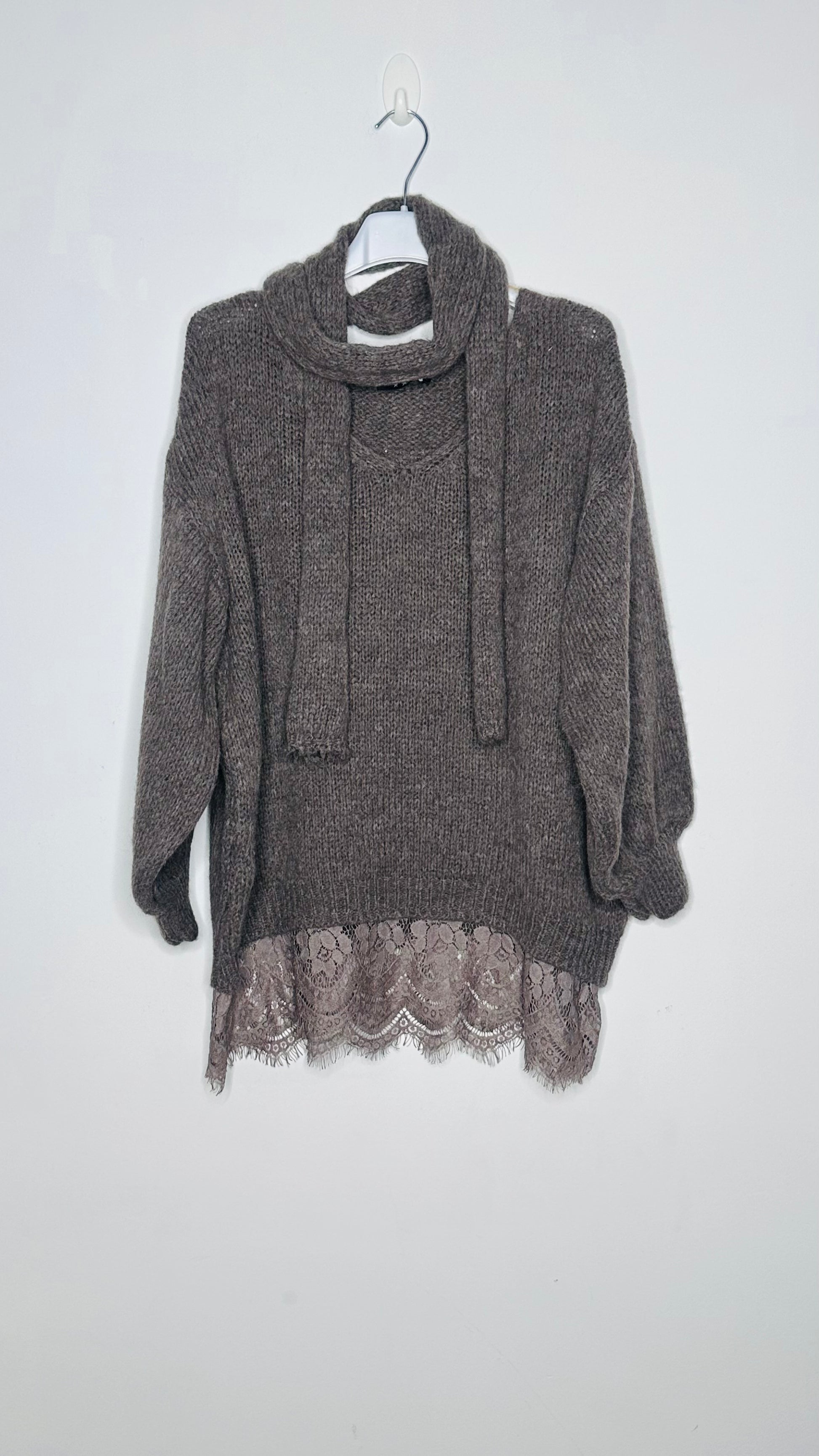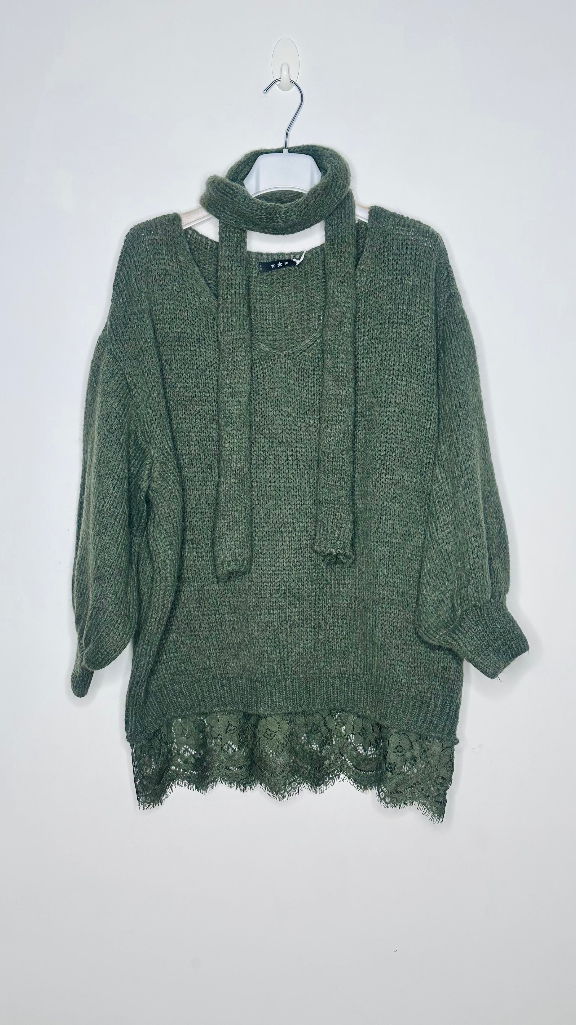 Jersey en cuello de pico, con manga larga y puntilla en el bajo de forma recta , con bufanda incluida