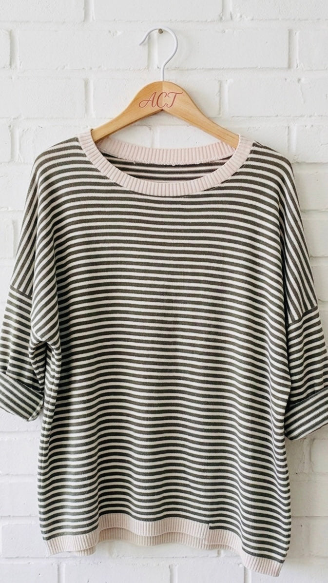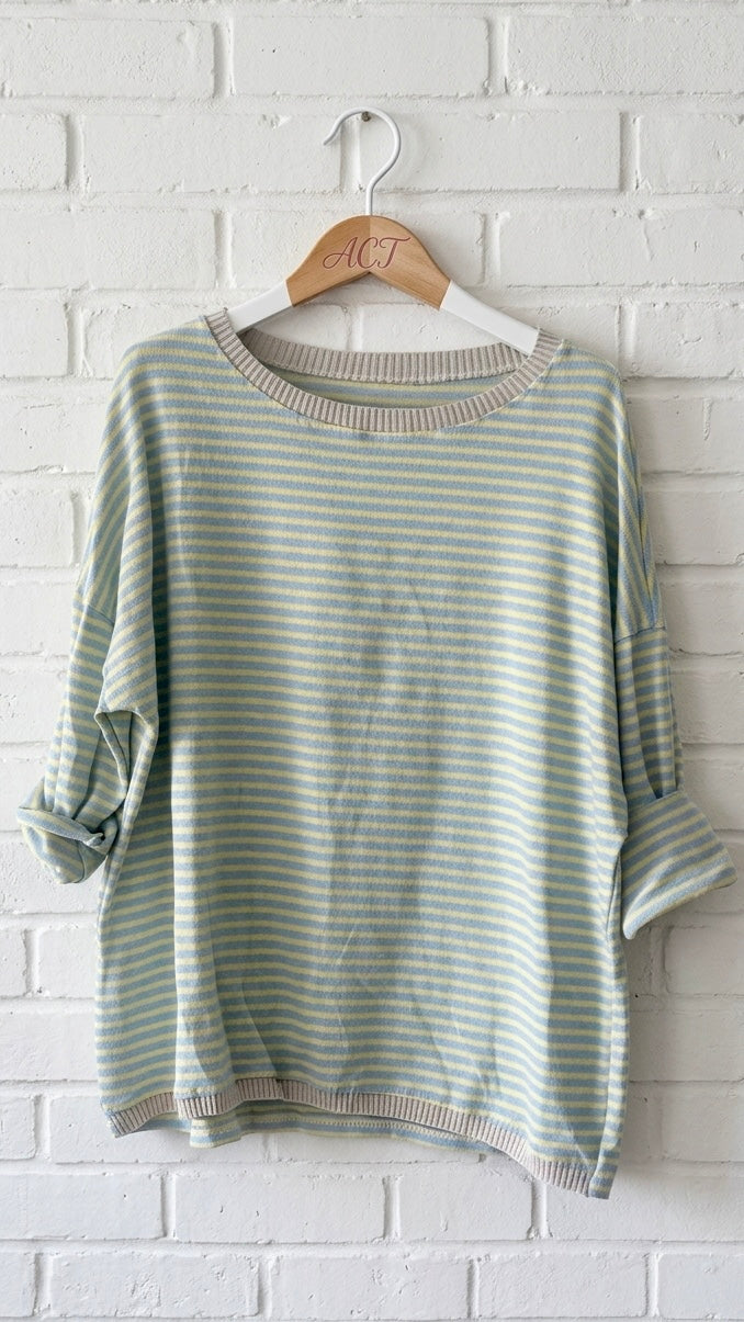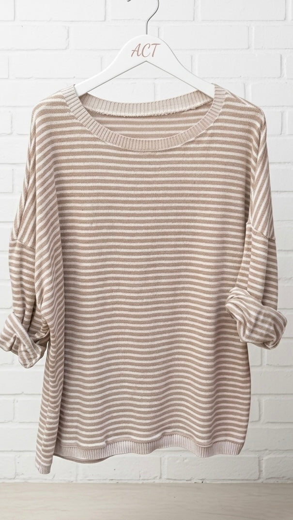 Estampado de rayas finas bicolores. Silueta clásica de cuello redondo con acabados acanalados en cuello, puños y bajo. Manga larga