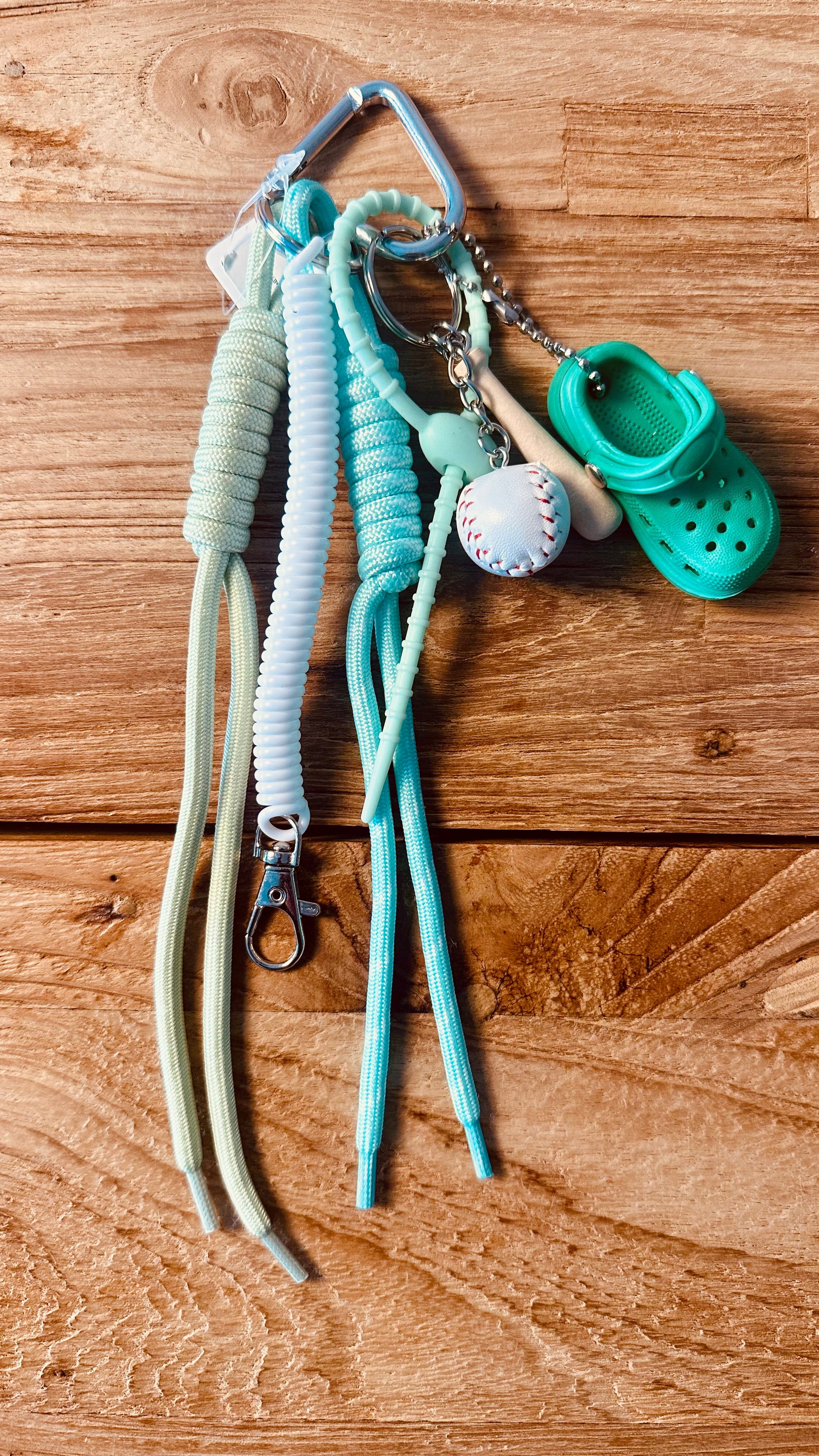 Llaver con charms , incluye zapatilla crocs, bate de béisbol y pelota , mosquetón en forma de corazón y cuerdas.
