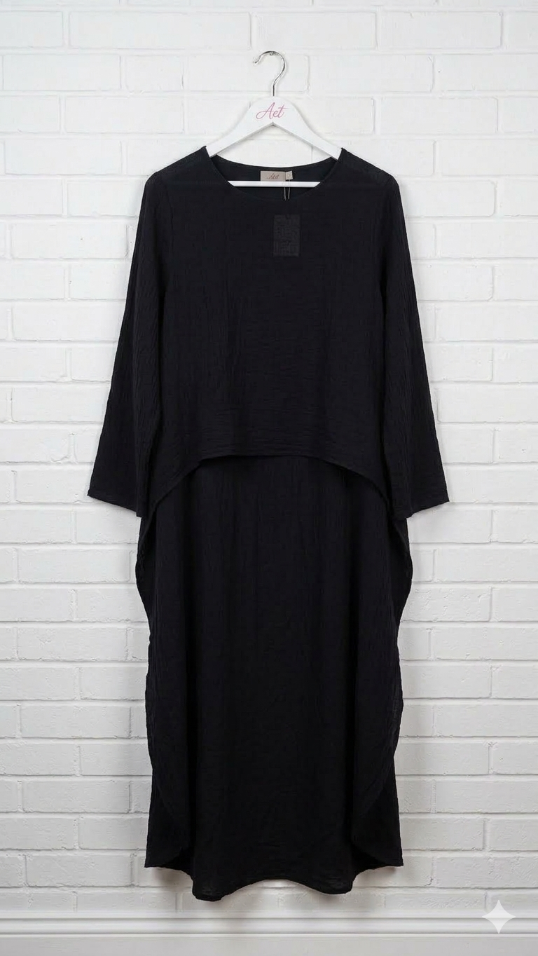 Blusa de corte asimétrico, corta por delante larga por detrás. Estilo súper favorecedor con cuello redondo y manga larga. Tejido natural suave y ligero.