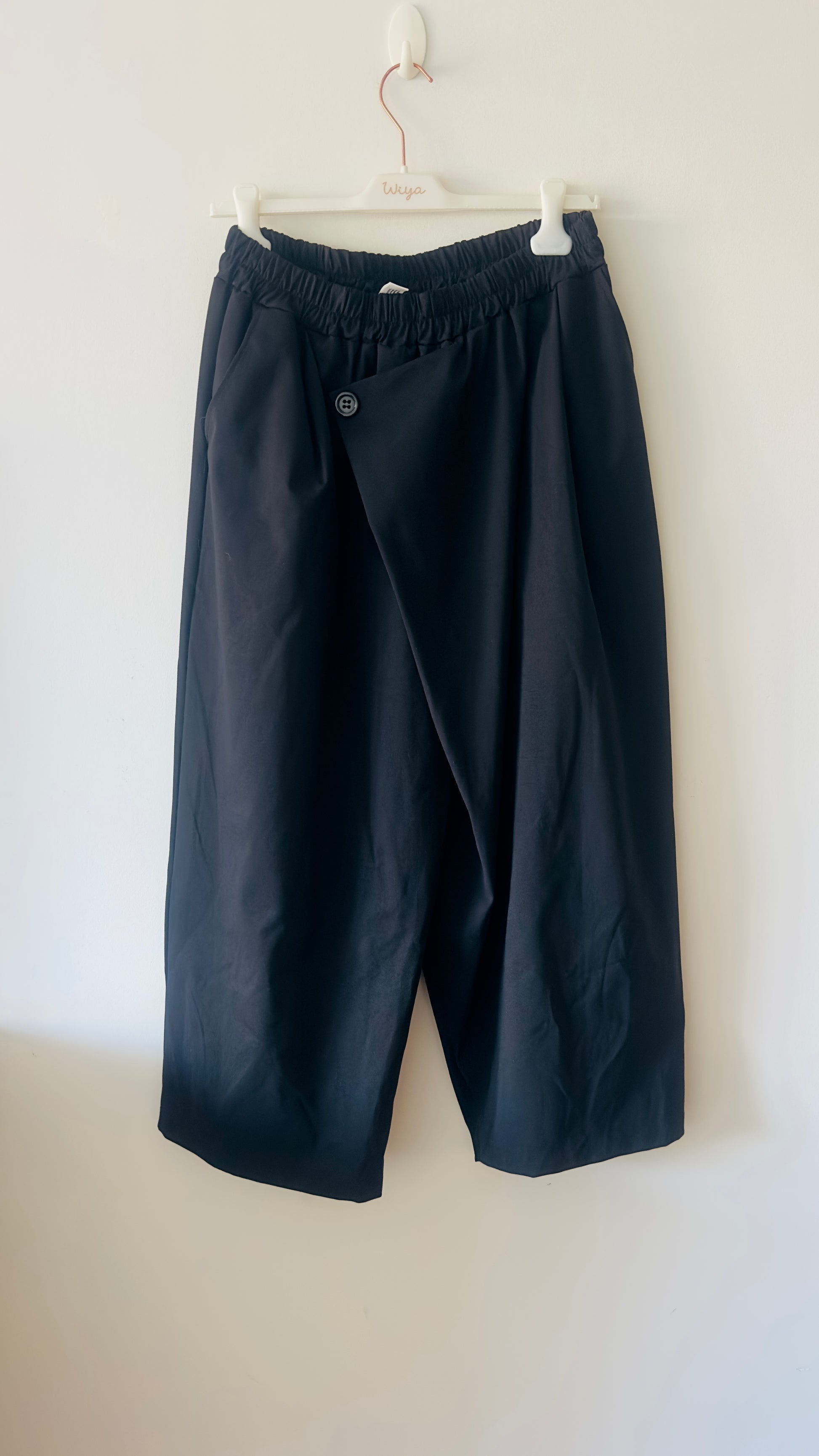Pantalón culote en tejido de neopreno fino con goma en la cintura, bolsillos laterales y botón cruzado de adorno con un bolsillo trasero.