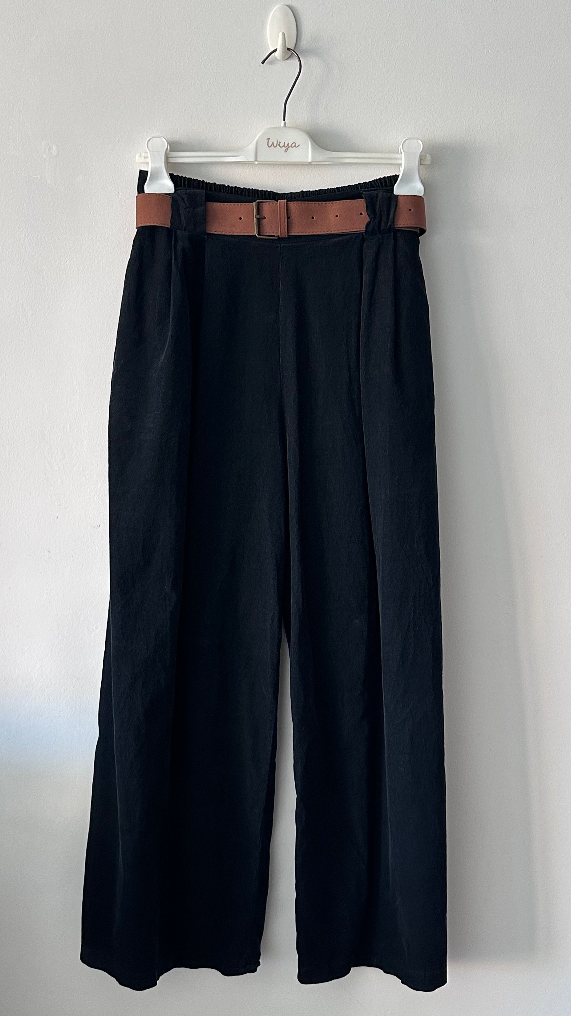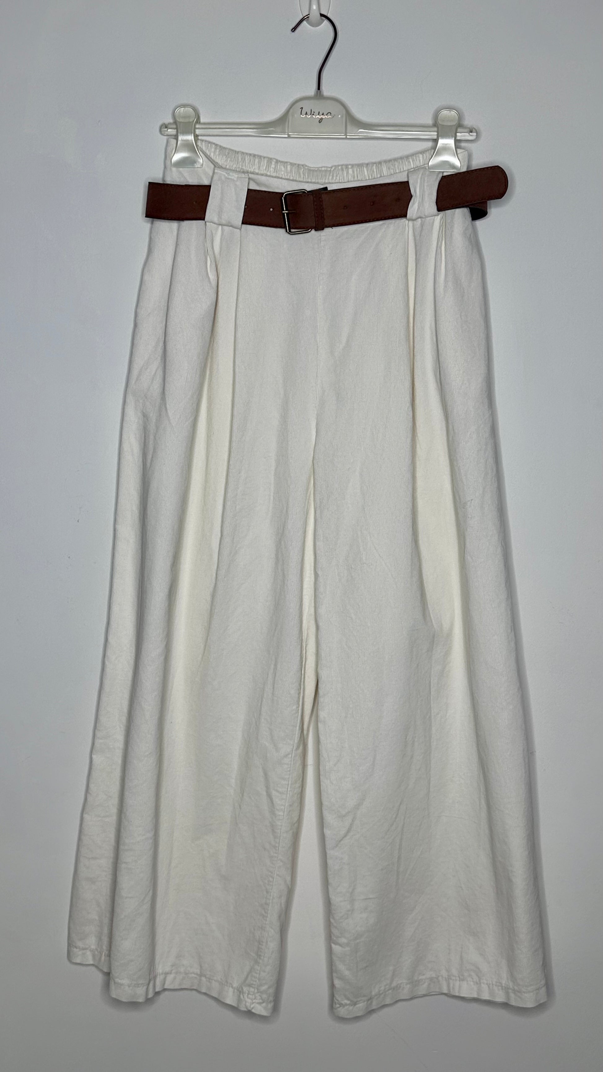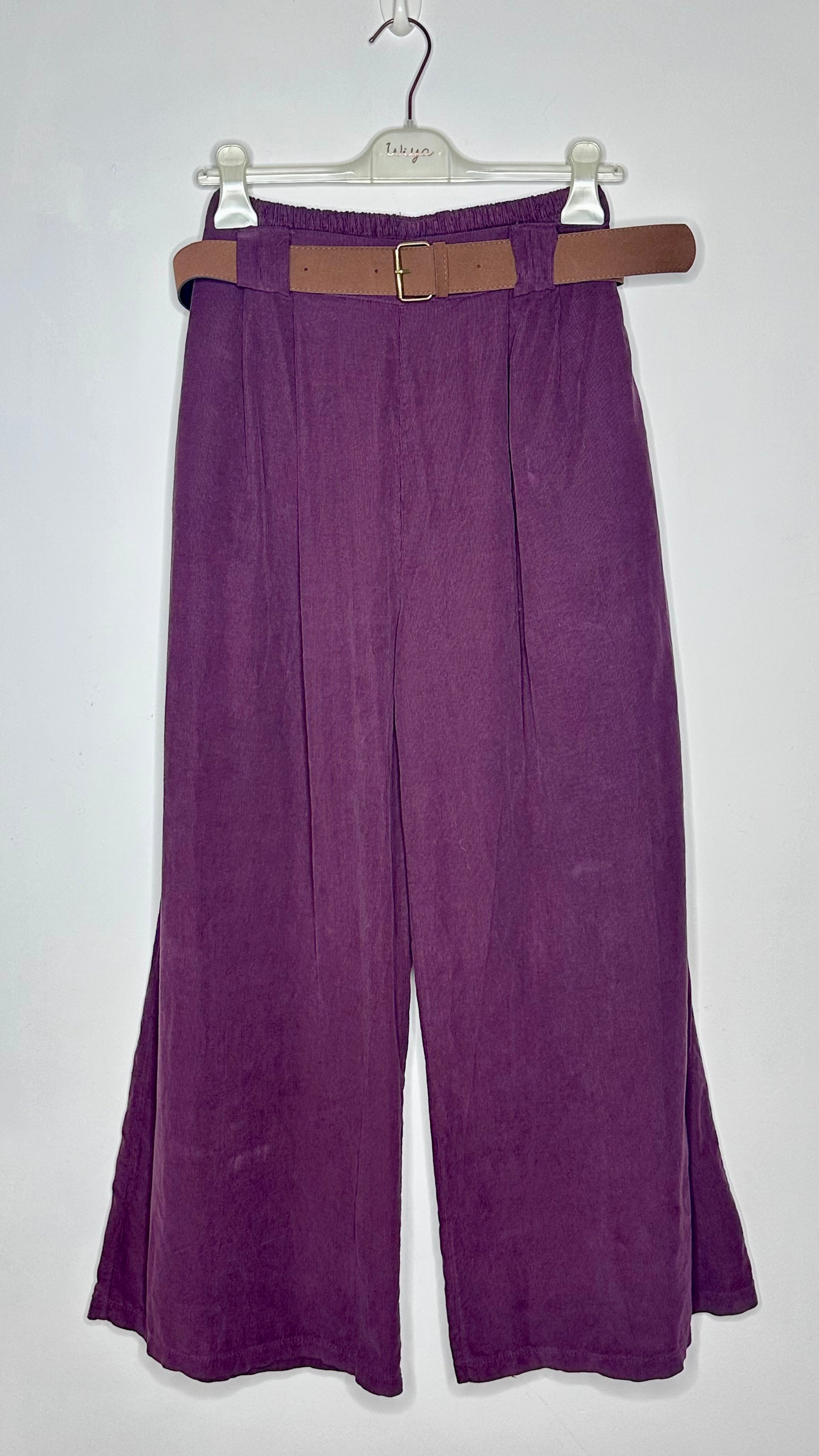 Pantalón ancho de micro pana con bolsillos laterales y pinzas frontales. Contiene cinturón y goma en la parte de atrás de la cintura. Largo hasta abajo.