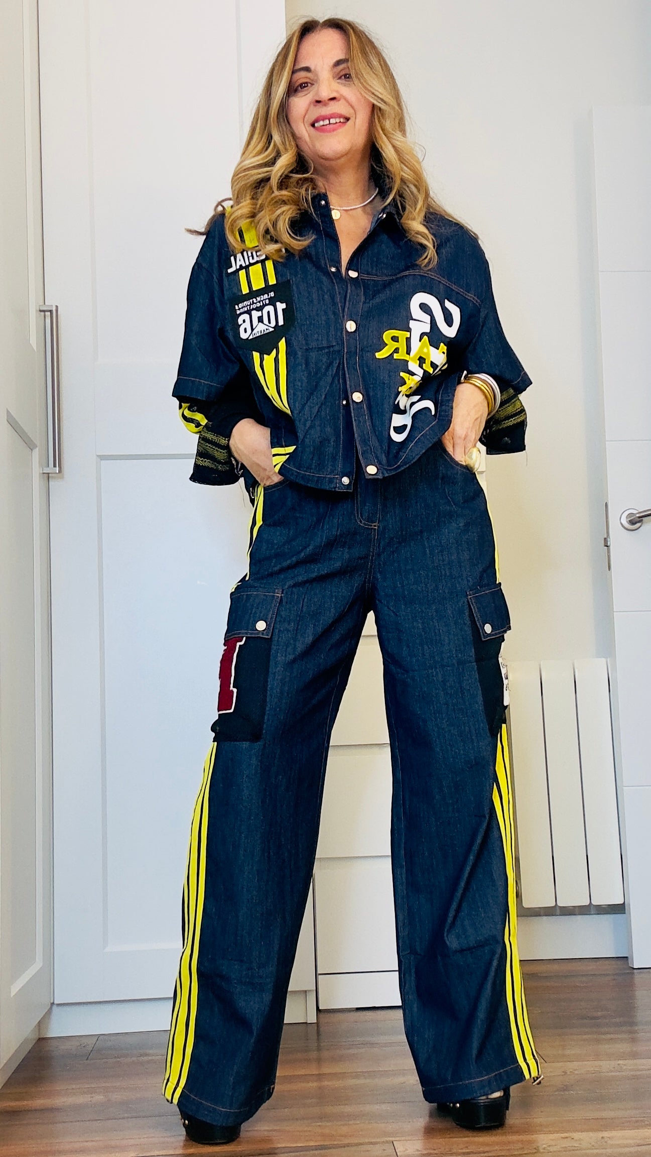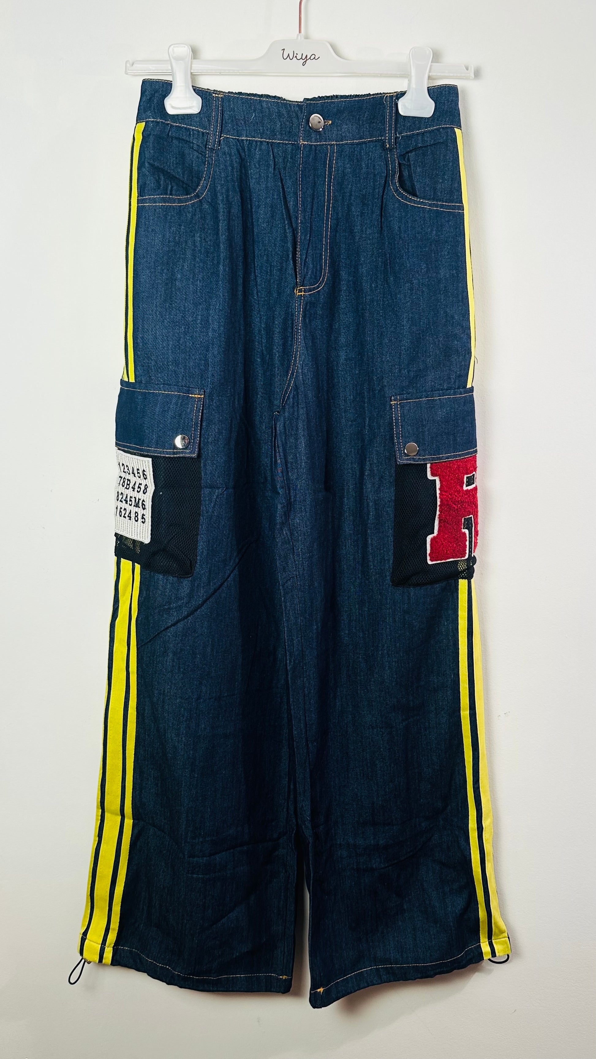 Pantalón denim tipo chándal con banda amarilla en laterales, bolsillos laterales De red con tapetes y parches. Goma en cintura trasera y bajo ajustable.