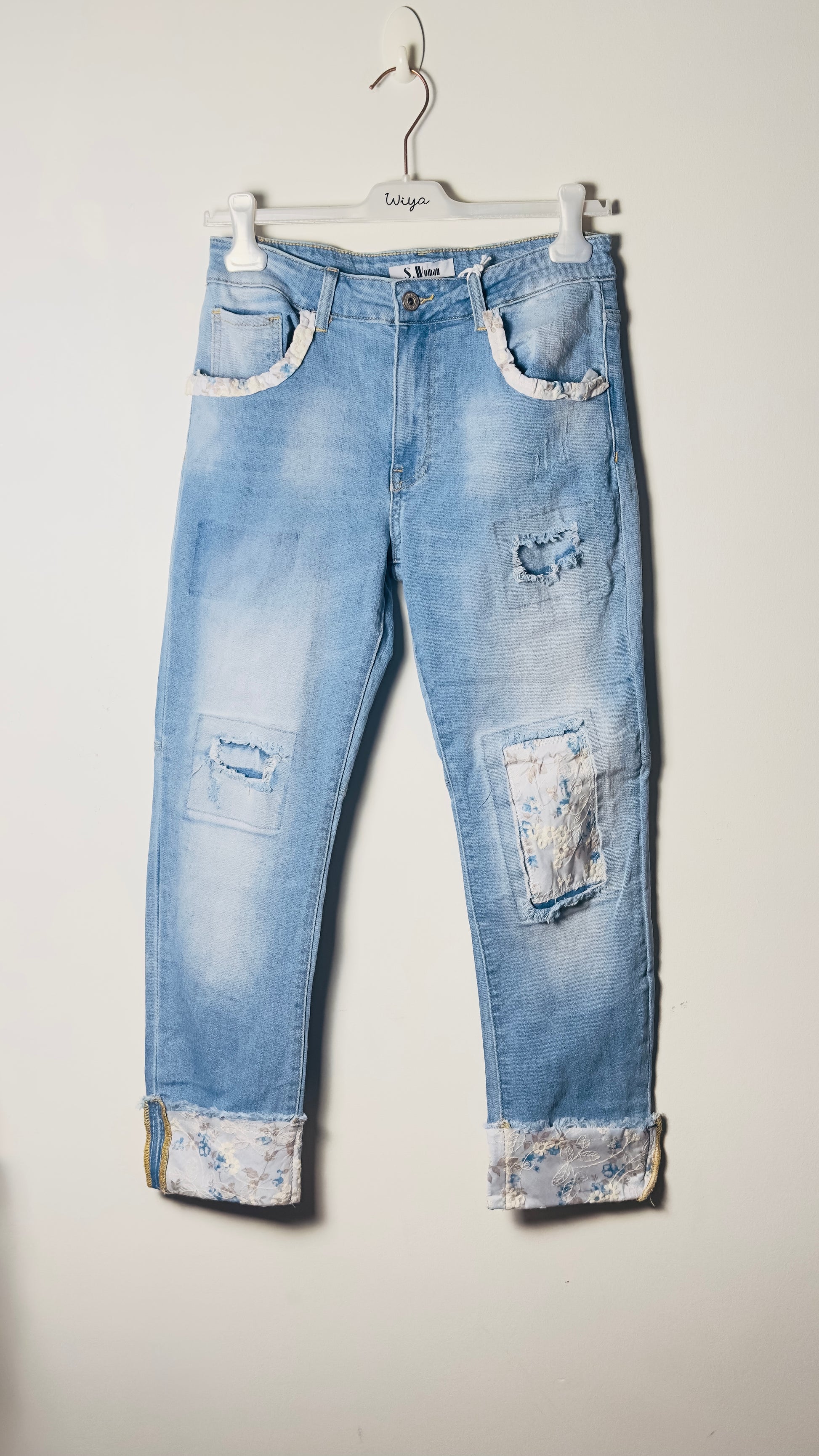 Pantalón tejano, tono, claro y tejido suave, de marca Swoman con parches de florecitas bordadas.