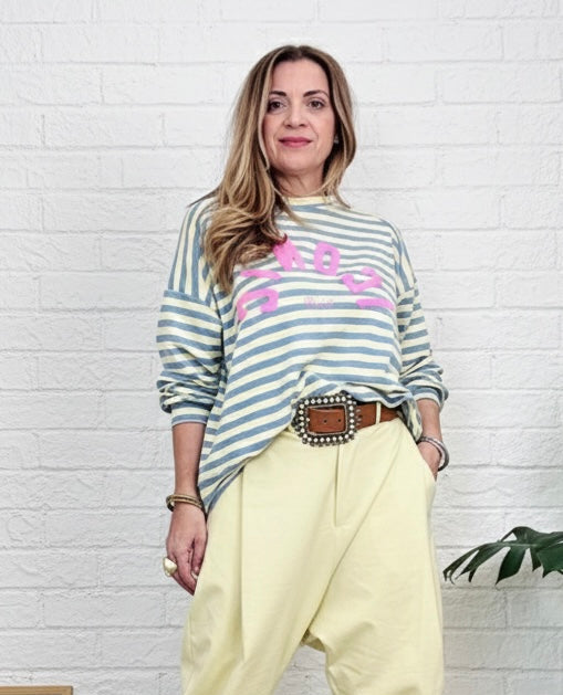 Sudadera de rayas con texto. En relieve con textura rizada,manga larga y cuello redondo. Ligera asimetría en el bajo y tejido suave.
