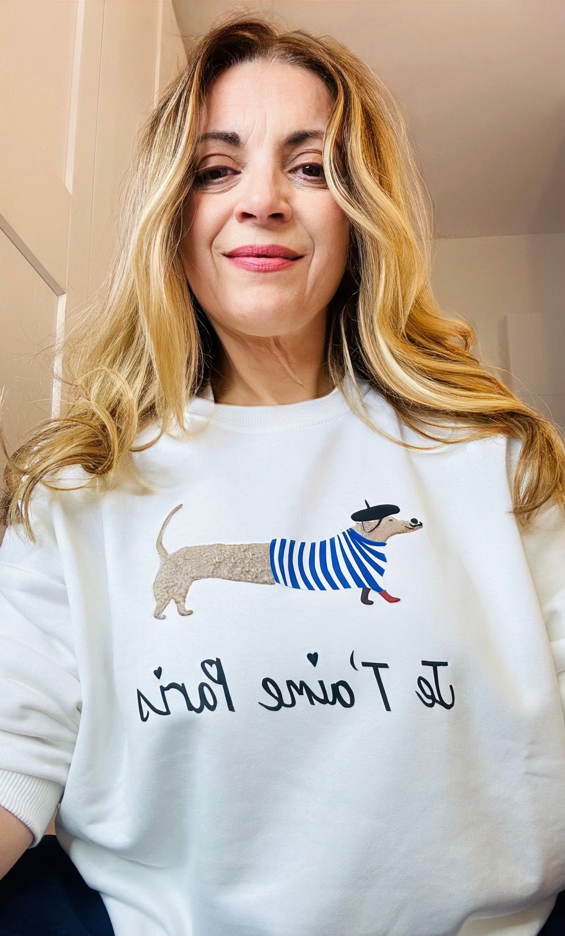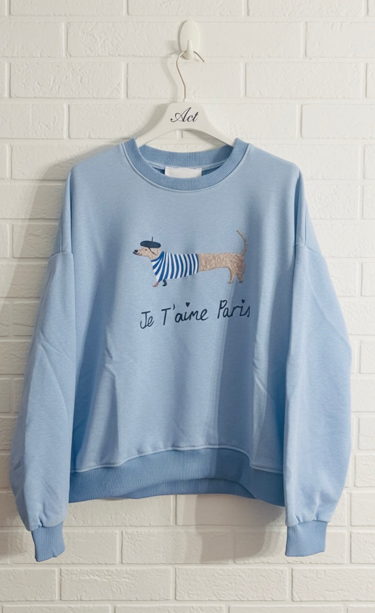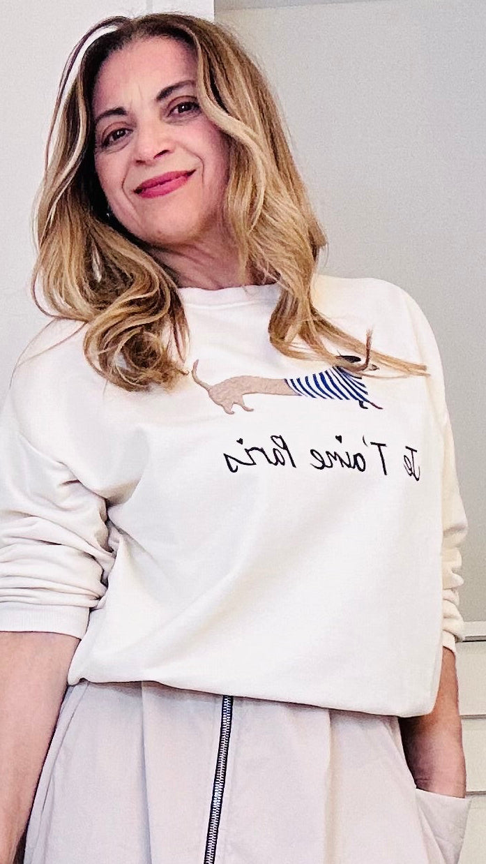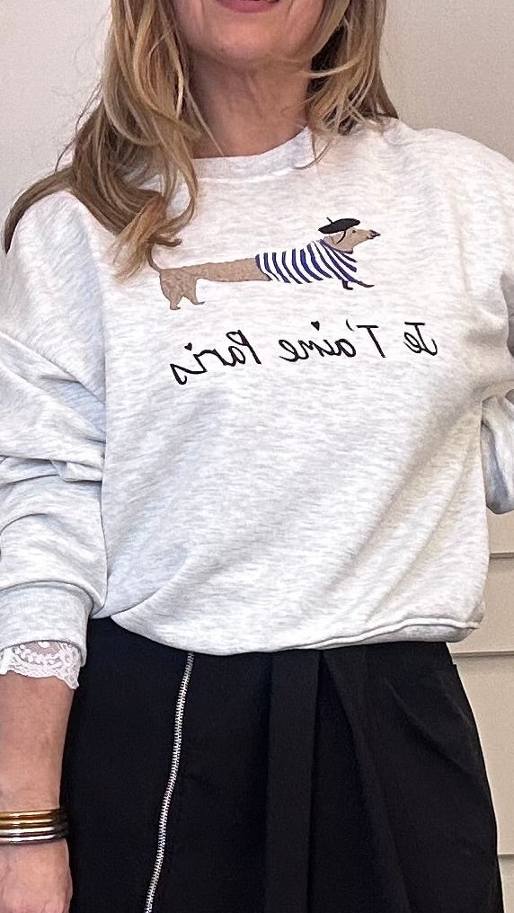 Sudadera con detalle de perro salchicha y texto. Cuello redondo y manga larga.