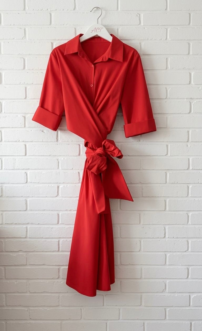 Corte midi, cuello camisero y cierre cruzado tipo wrap. Mangas 3/4 con puño ancho y ajuste entallado en cintura.